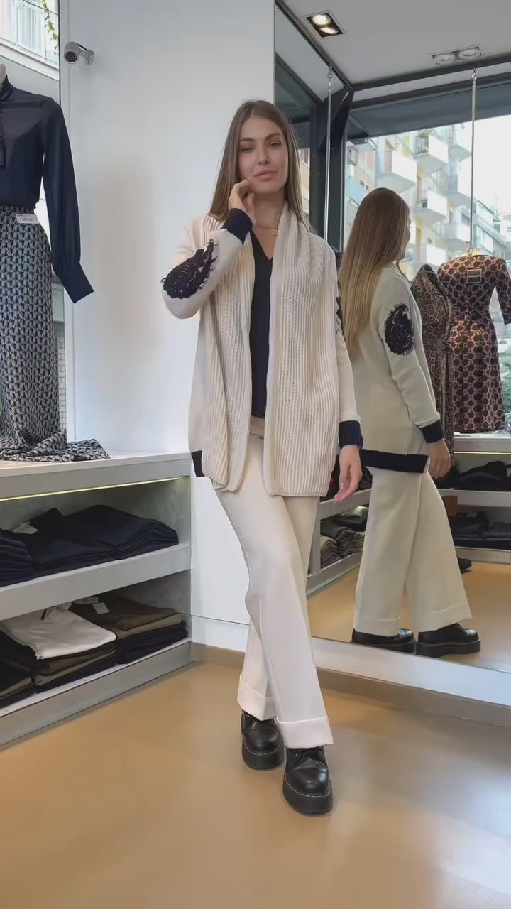 Un capo versatile e sofisticato per il tuo guardaroba: questo cardigan in maglia a coste offre comfort e stile in un unico design. Realizzato con materiali di alta qualità, presenta dettagli ricamati a contrasto sulle maniche, che aggiungono un tocco di originalità. La linea morbida e avvolgente lo rende perfetto per essere indossato sopra qualsiasi outfit, dal casual al più elegante. Ideale da abbinare a pantaloni sartoriali o jeans, è il capo must-have per la stagione, garantendo praticità e raffinatezza in ogni occasione.
