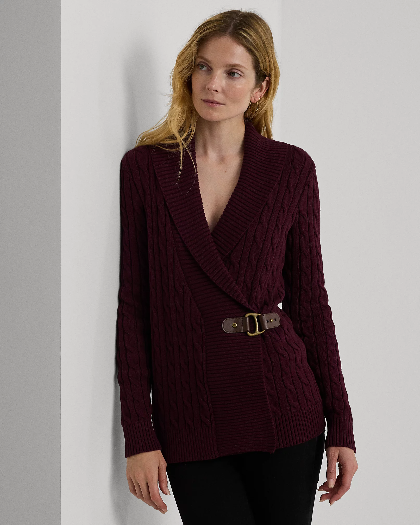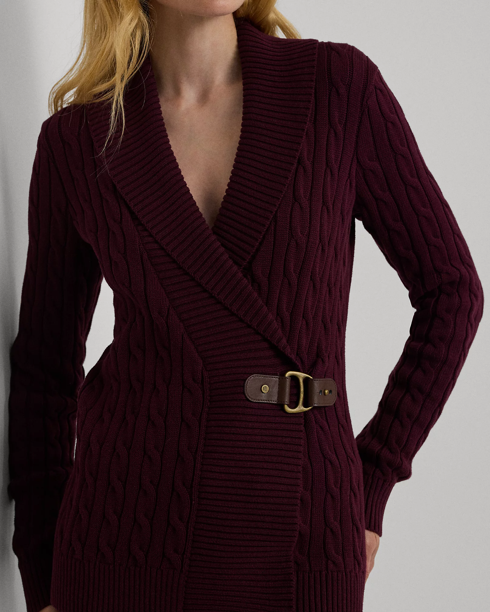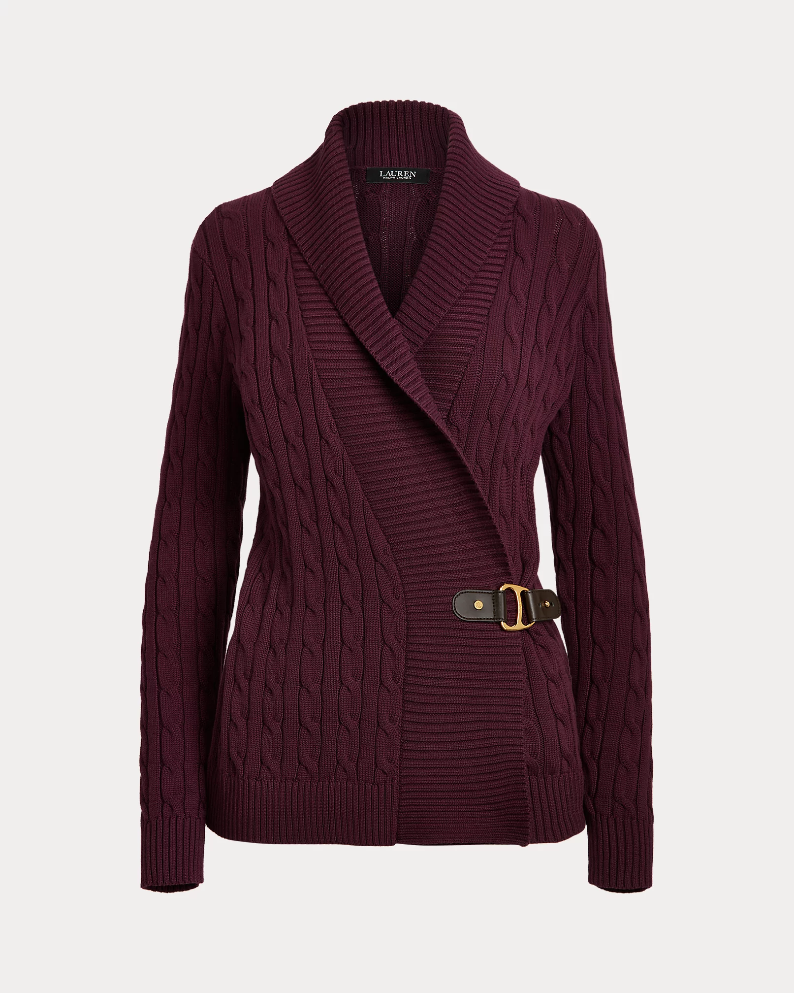 Il finto cardigan di cotone a trecce è caratterizzato da una fibbia di chiusura in pelle ecologica con logo inciso. Composizione 100% cotone, lavabile in lavatrice. Vestibilità comoda e design elegante firmato Lauren Ralph Lauren.