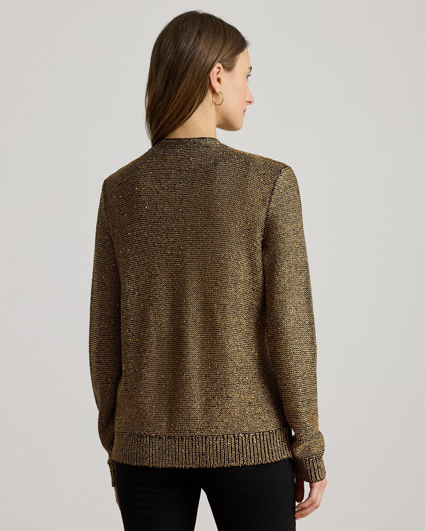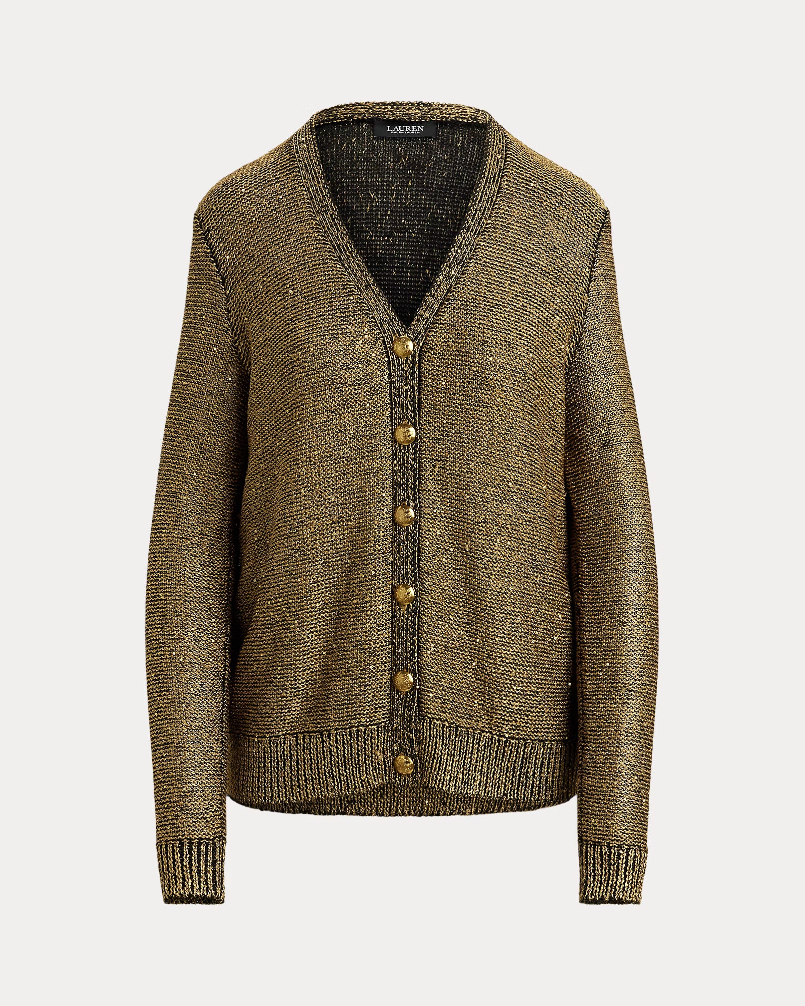 Cardigan in maglia oro con filamenti neri e bottoni dorati