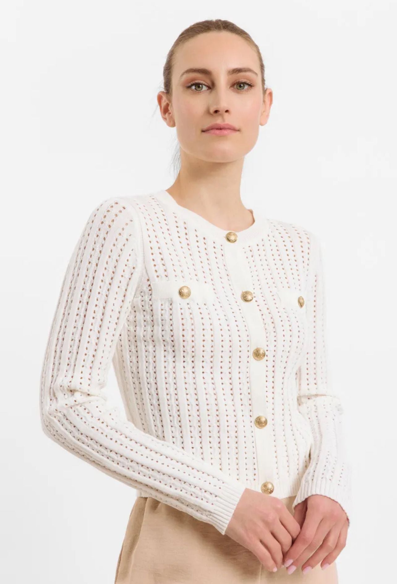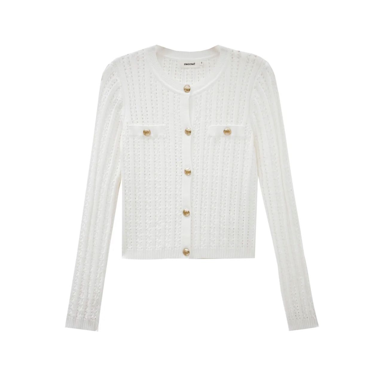 Questo raffinato cardigan aperto traforato, ispirato al classico stile Chanel, è un capo elegante e versatile da avere nel tuo guardaroba. Caratterizzato da una vestibilità aderente che esalta la figura, è realizzato in un tessuto di qualità (65% viscosa, 35% poliammide) per una sensazione morbida e confortevole. Il motivo traforato e i bottoni dorati donano un tocco di lusso, perfetto per outfit sia formali che casual chic.