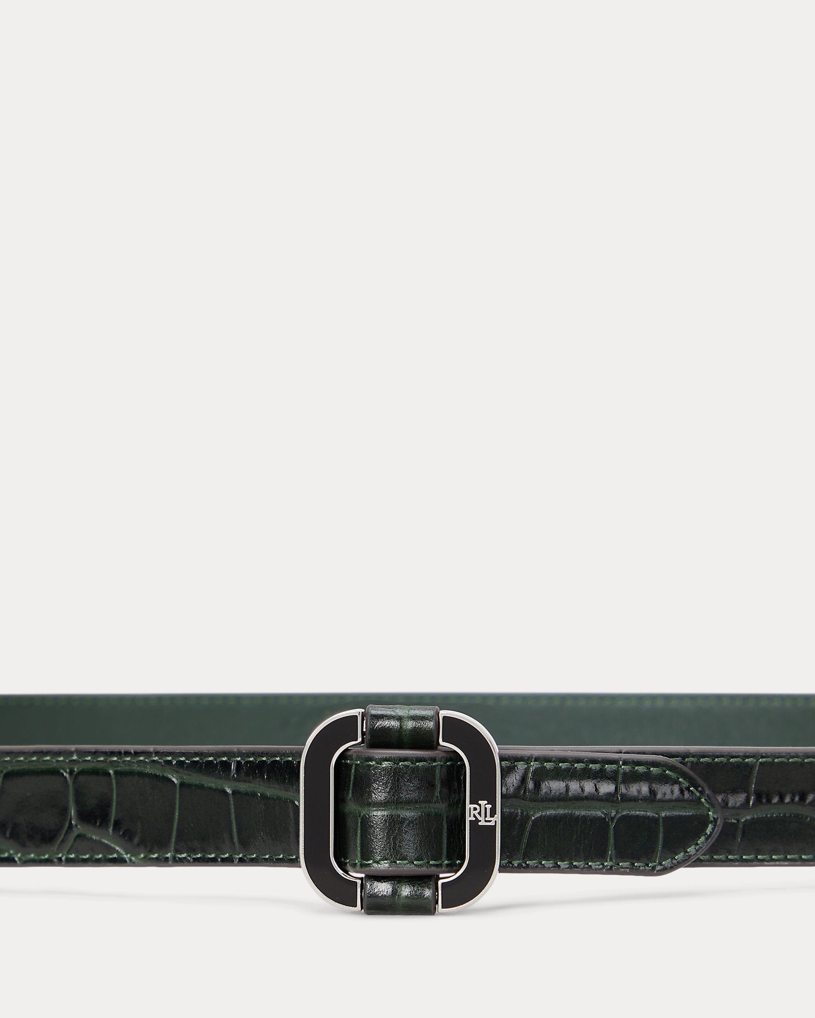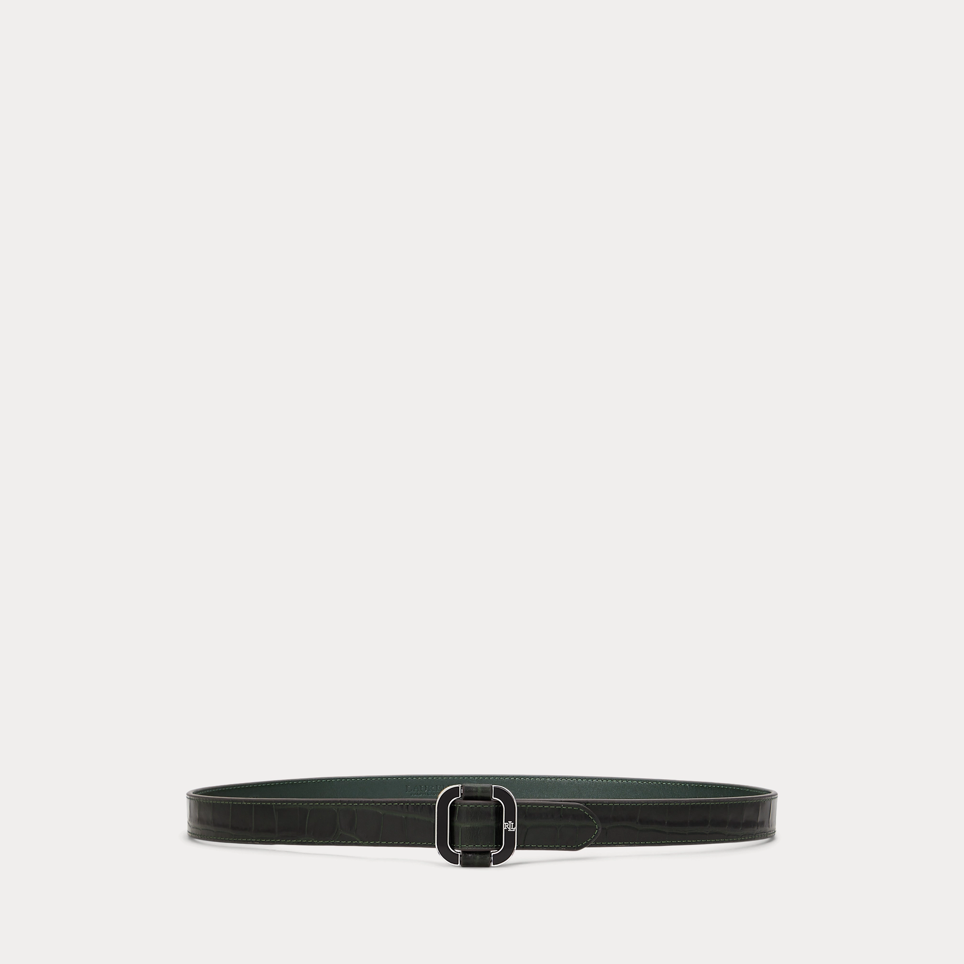 Questa cintura sottile, con fibbia scorrevole smaltata e logo "LRL" in metallo, è realizzata in pelle goffrata effetto coccodrillo per un tocco elegante. La fodera in pelle pieno fiore, morbida e liscia, aggiunge un dettaglio raffinato. Composizione 100% pelle bovina. La taglia XS è lunga 86,4 cm, la taglia S è lunga 94 cm, la taglia M è lunga 101,6 cm, la taglia L è lunga 109,2 cm, la. Colore verde scuro. Lavaggio professionale specifico per la pelle.