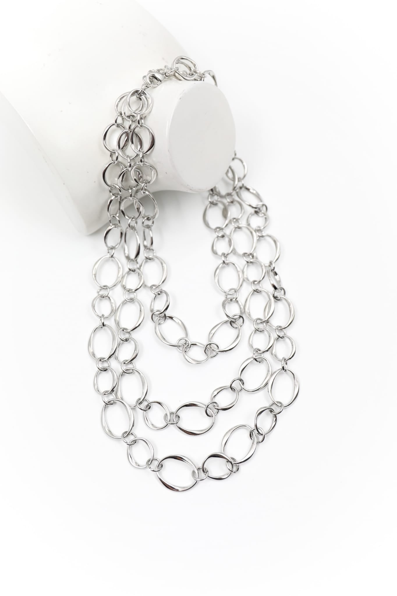 Questa versatile collana a più giri è l'accessorio ideale per un look d'impatto. Realizzata con una cascata di catene a maglie ovali di diverse dimensioni, crea un design dinamico e moderno.