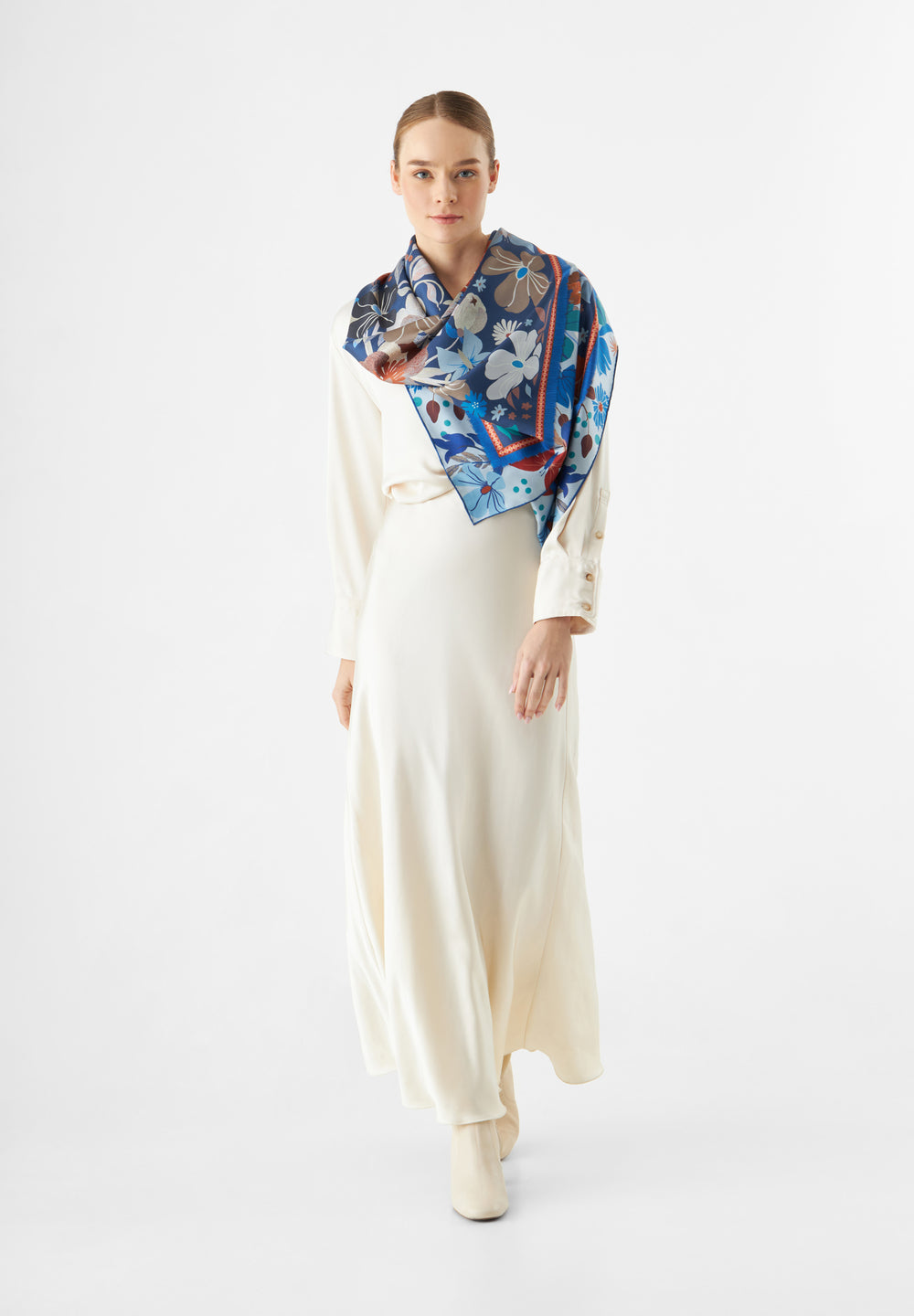 Questo foulard in seta pregiata, decorata con un raffinato motivo floreale blu, aggiunge un tocco di eleganza a ogni look. Realizzata a mano con seta pura di alta qualità, offre una morbidezza avvolgente e una brillantezza eccezionale su entrambi i lati. Perfetta per esaltare un tailleur classico, valorizzare outfit in denim o come accessorio nei capelli, unisce lusso e versatilità in un unico capo senza tempo. Dimensione 110x110. Composizione 100% seta.
