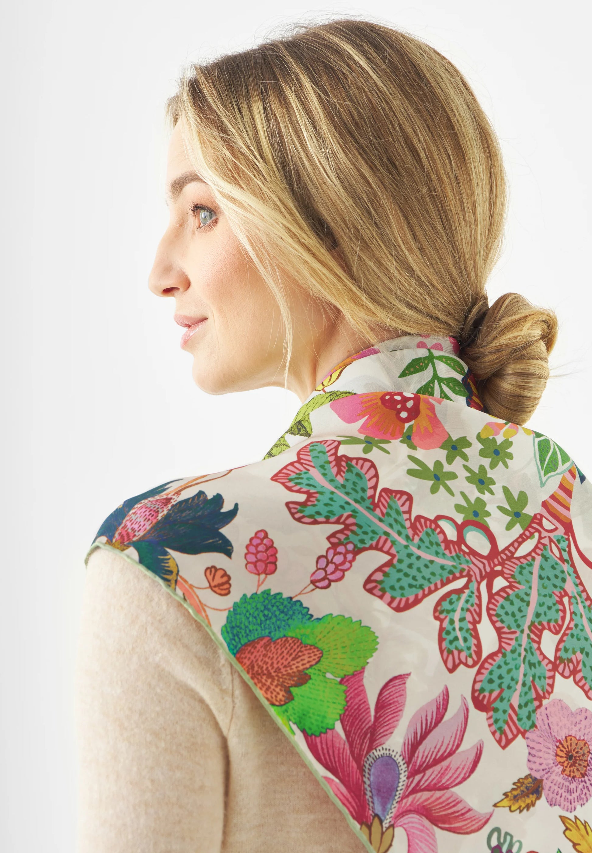 Eleva il tuo stile con questo splendido foulard quadrato da 105x105 cm, realizzato interamente in seta pura di altissima qualità. La texture setosa e la lucentezza naturale del tessuto esaltano una stampa botanica d'ispirazione artistica, dove fiori esotici e foglie dettagliate si intrecciano in una danza di colori vibranti su una base neutra e luminosa.
