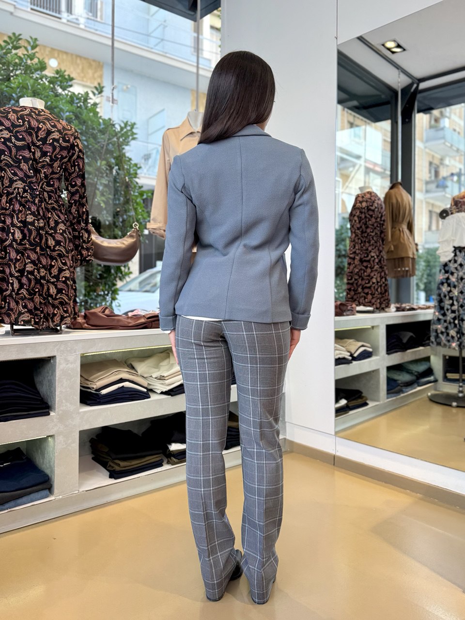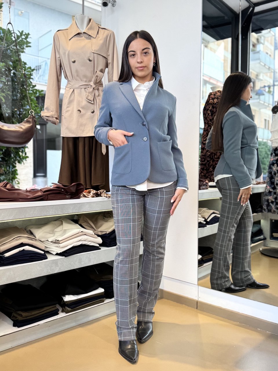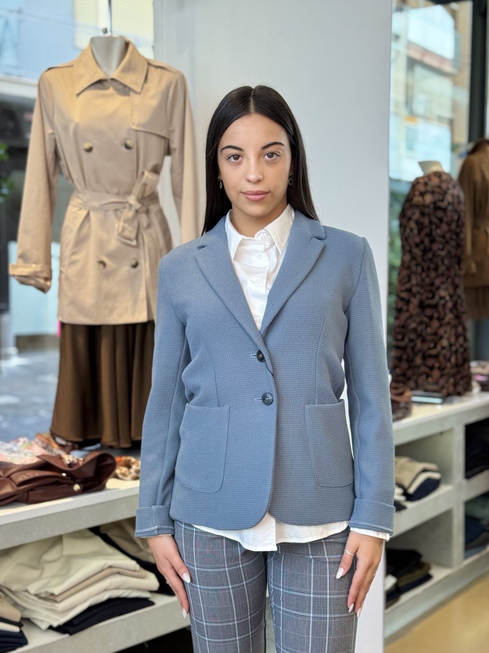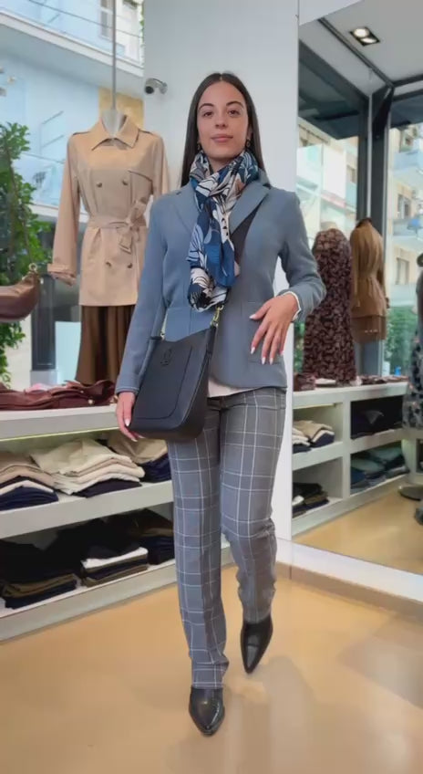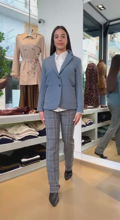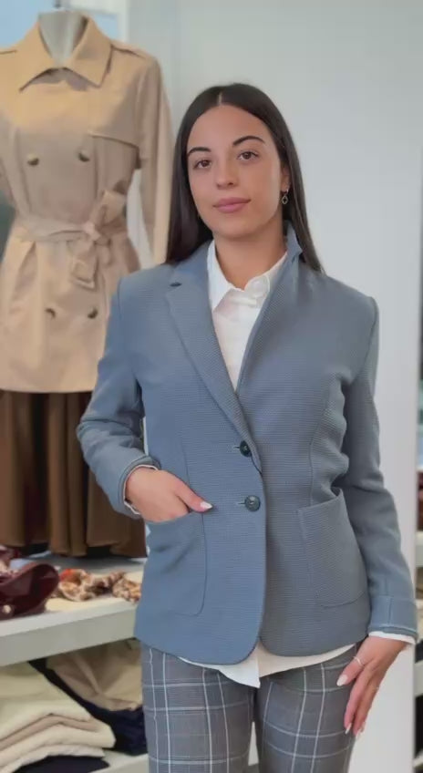 Questa giacca in stuoia armaturata di misto viscosa stretch presenta una costruzione formale che valorizza la silhouette femminile con una linea leggermente sfiancata e il punto vita delineato. Il collo con rever e la chiusura a due bottoni a vista conferiscono un'eleganza sobria, mentre le tasche applicate con impunture a vista aggiungono dettaglio e funzionalità. Ideale abbinata a una camicia e una longuette, è perfetta per un look cittadino sofisticato. Composizione: 72% poliestere, 27% viscosa, 1% elastan. Lavaggio in acqua.
