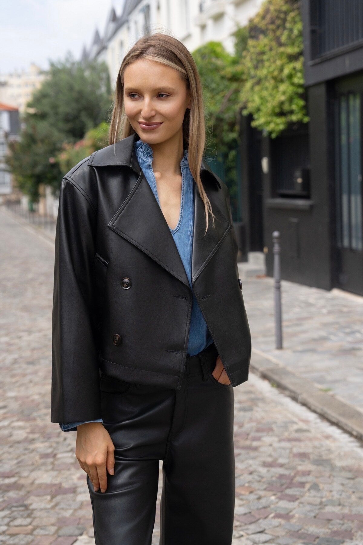 Questa giacca corta in stile trench unisce eleganza e modernità grazie al suo design a doppio petto con chiusura incrociata e collo a revers oversize. Realizzata in similpelle composta da poliestere e P.U., offre un aspetto sofisticato senza rinunciare alla praticità delle due tasche laterali. Perfetta per completare look professionali con un tocco contemporaneo.