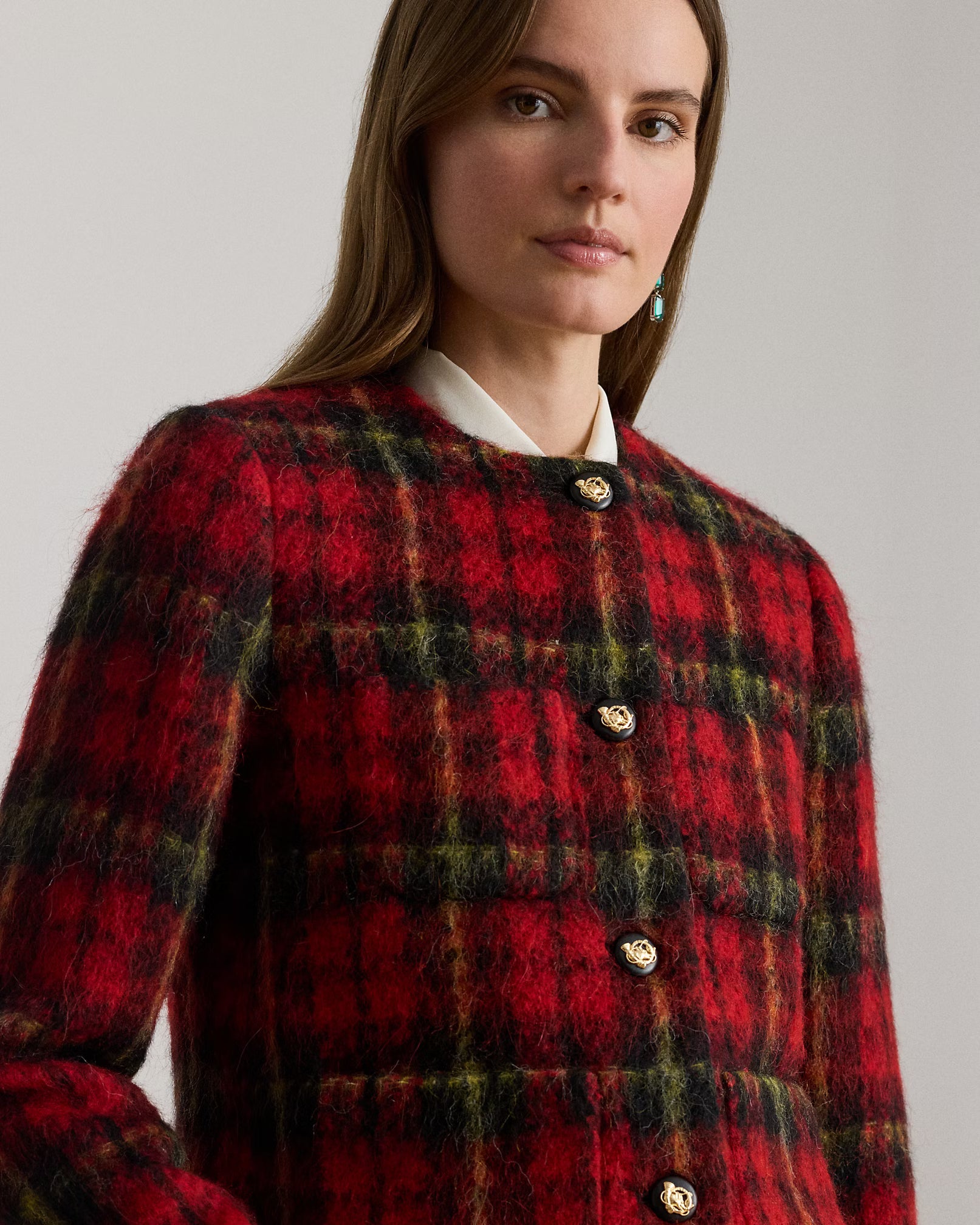 Questa giacca corta, ispirata ai modelli vintage, è confezionata in morbido mohair italiano tinto in filo con il caratteristico motivo scozzese di stagione. Presenta una vestibilità dritta e accorciata, pensata per arrivare all’altezza dei fianchi, con scollo arrotondato e abbottonatura frontale impreziosita da bottoni decorati con teste di volpe. Caratterizzata da maniche lunghe con spalline e quattro tasche applicate — due sul petto e due in vita — unisce eleganza e funzionalità in un capo raffinato dal fascino senza tempo. Composizione: 34% poliestere, 20% lana, 15% cotone, 15% acrilico, 7% pelo di alpaca, 4% viscosa, 3% altre fibre. Fodera: 94% poliestere, 6% elastan. Lavare a secco