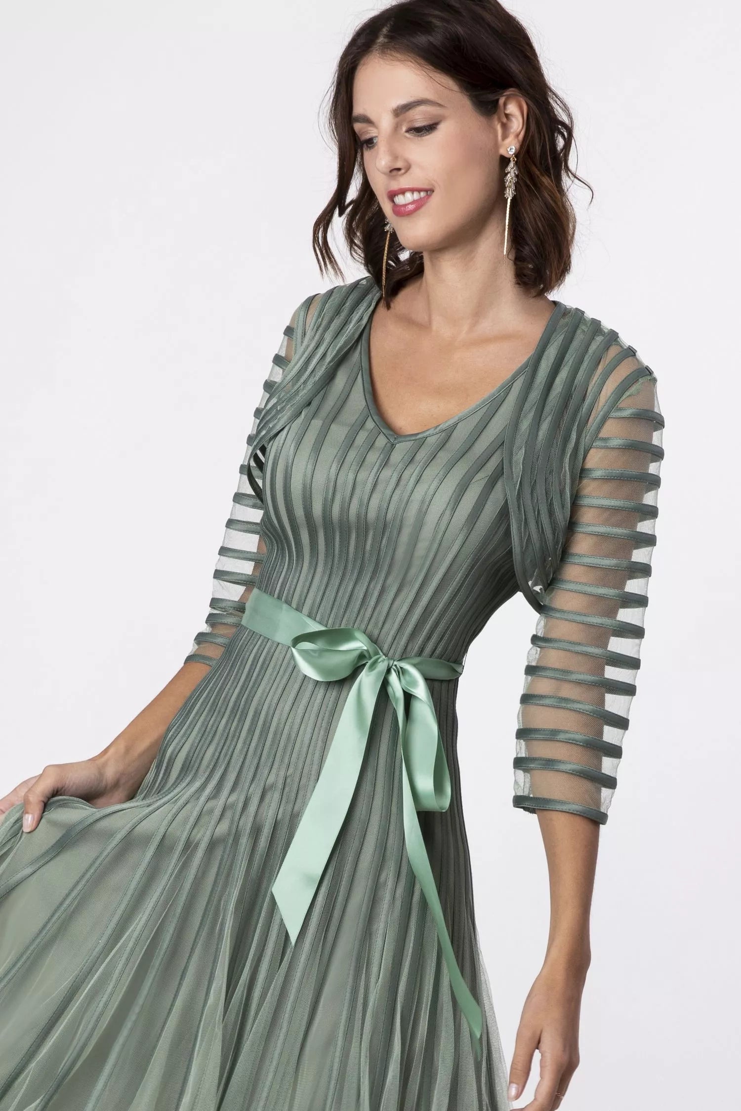 Questo bolero in tulle verde salvia unisce eleganza e leggerezza, ideale per valorizzare ogni abito da sera. Le bande in raso, disposte orizzontalmente sulle maniche a tre quarti e verticalmente sulle spalline, creano un effetto di trasparenza raffinata che offre una copertura sofisticata senza compromettere la delicatezza del capo. Perfetto per completare il tuo look con stile, questo bolero è disponibile in vari colori per adattarsi a diverse esigenze di abbinamento.