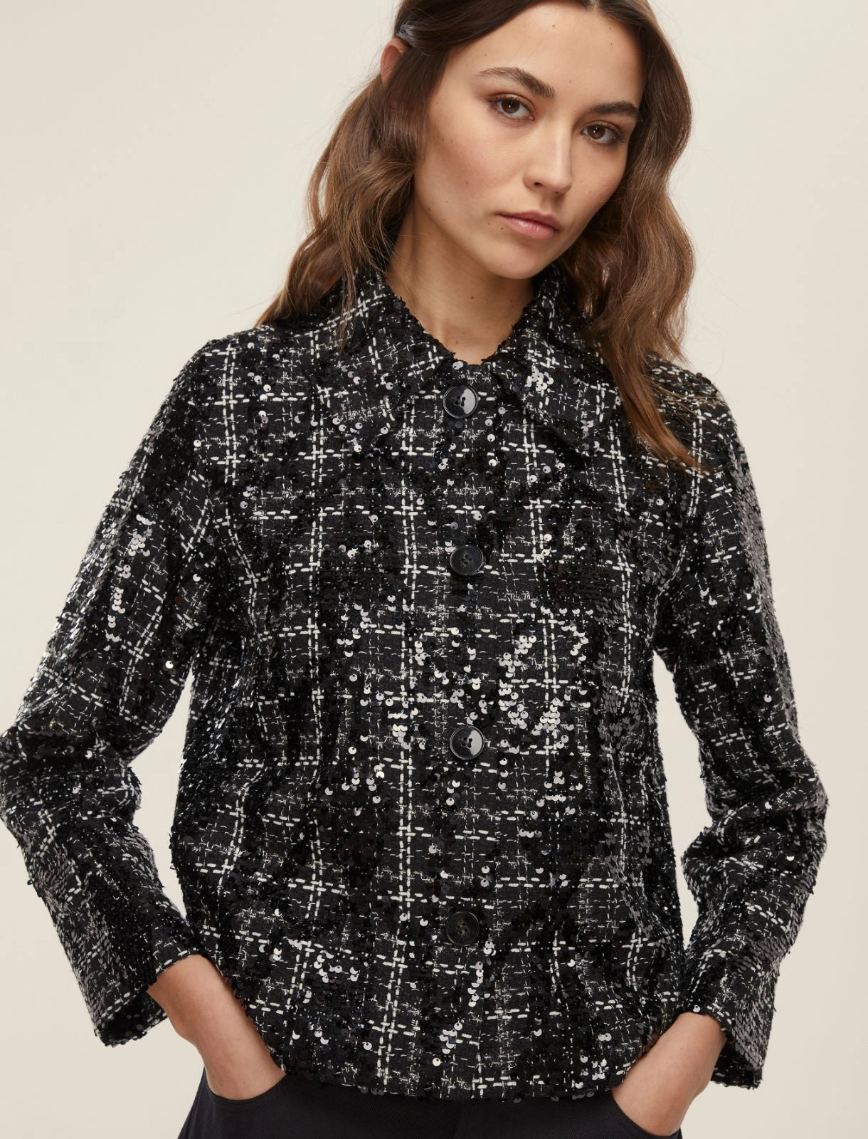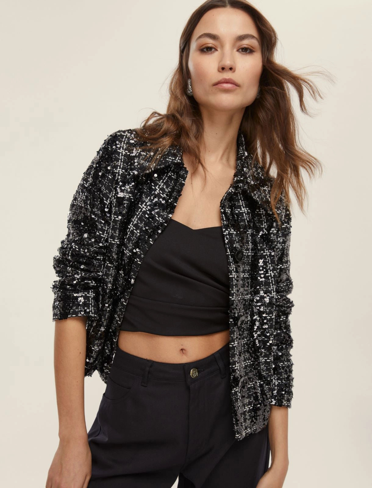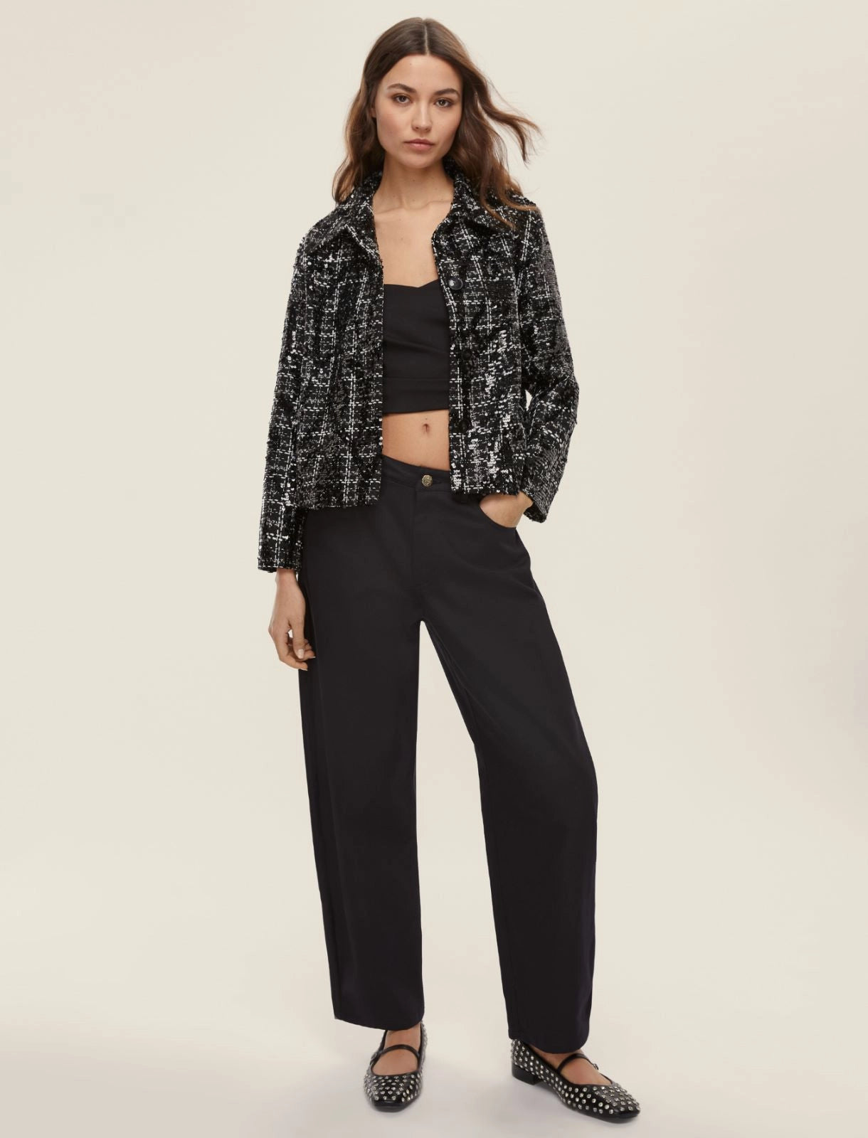 Questa giacca corta in stuoia, impreziosita da un filo di lurex e paillettes ricamate, unisce eleganza e luce in ogni dettaglio. Il taglio dritto e il collo a camicia conferiscono un tocco lady like, mentre la chiusura monopetto con bottoni a vista e le comode tasche laterali completano il design funzionale. Foderata per garantire comfort, è ideale per chi vuole distinguersi con raffinatezza in città. Tessuto 63% poliestere, 15% viscosa, 14% cotone, 4% acrilica, 3% altre fibre, 1% fibra metallizzata; filo di legatura 100% poliestere; fodera 97% poliestere, 3% elastan. Lavare a mani.