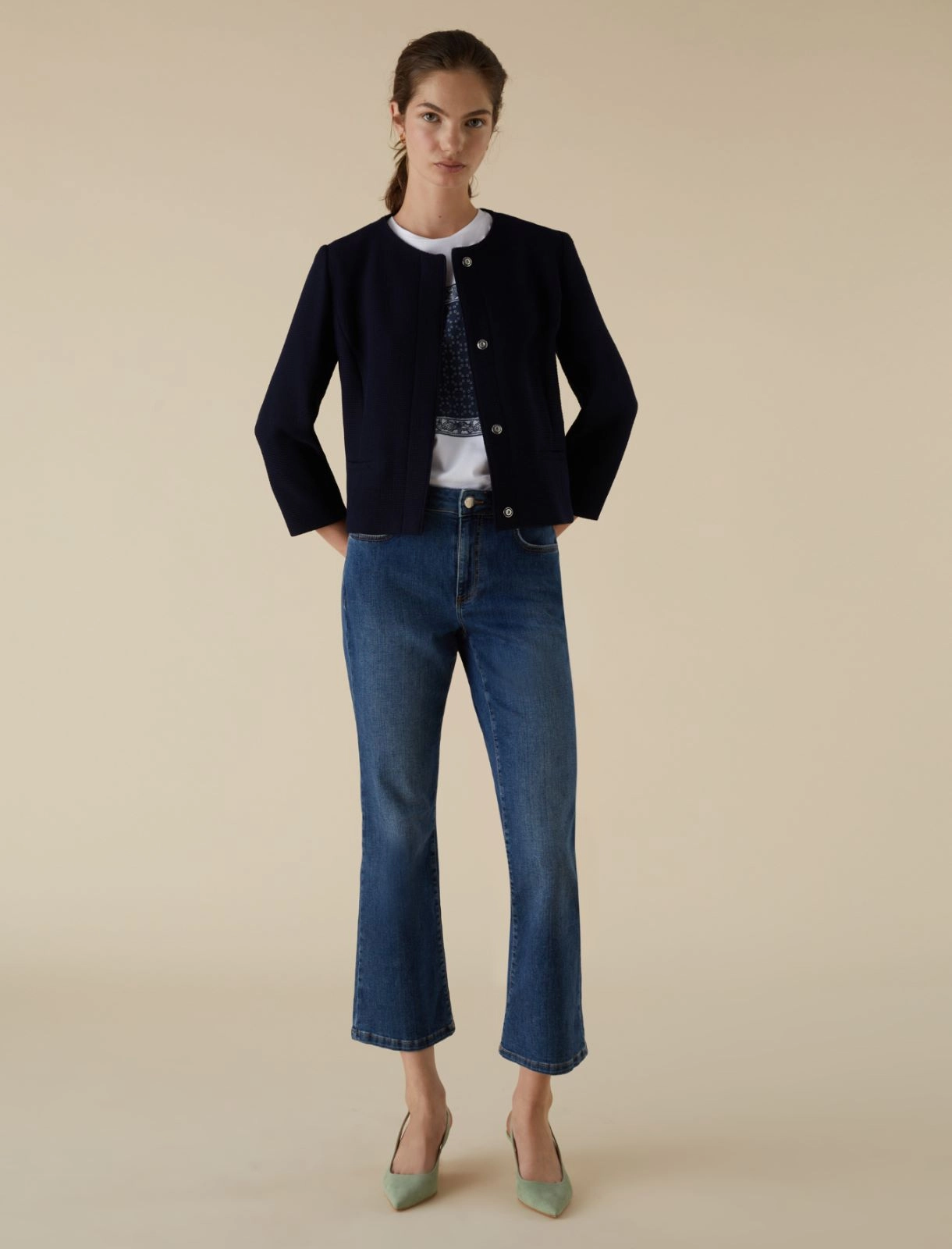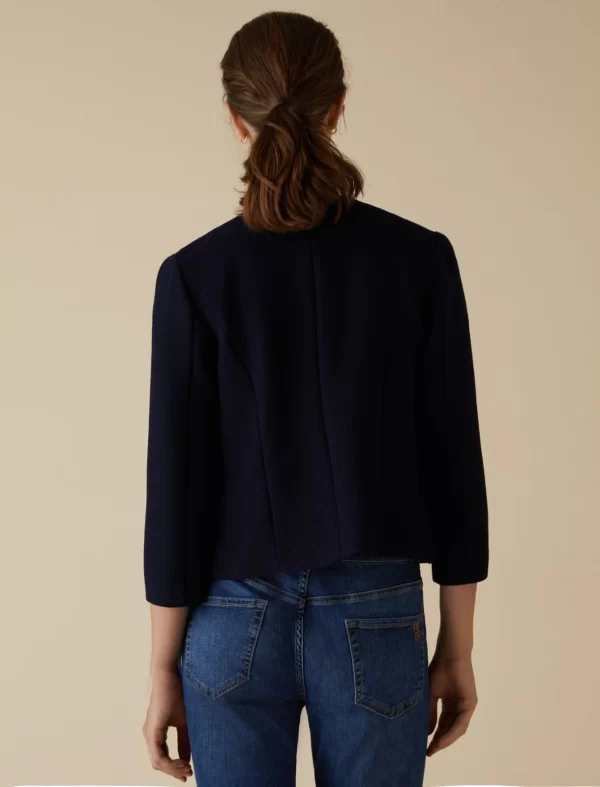 Giacchina blu dal taglio sartoriale e silhouette sfiancata