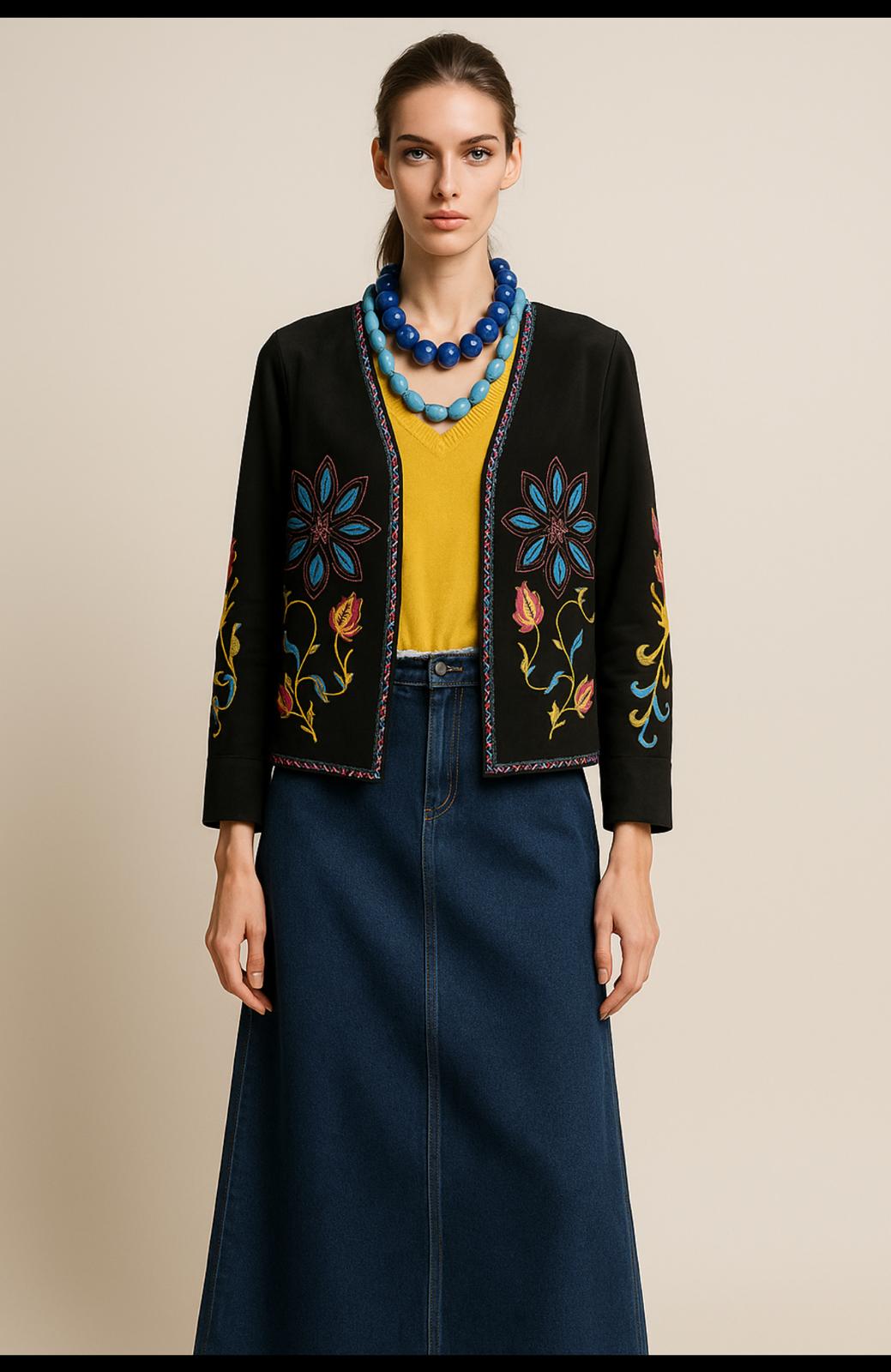 Il tessuto, un mix di 65% cotone e 35% poliestere, offre la morbidezza del camoscio senza rinunciare alla praticità e alla resistenza. La caratteristica principale sono i ricami floreali multicolore, che decorano il davanti e le maniche con vivacità e stile artigianale.