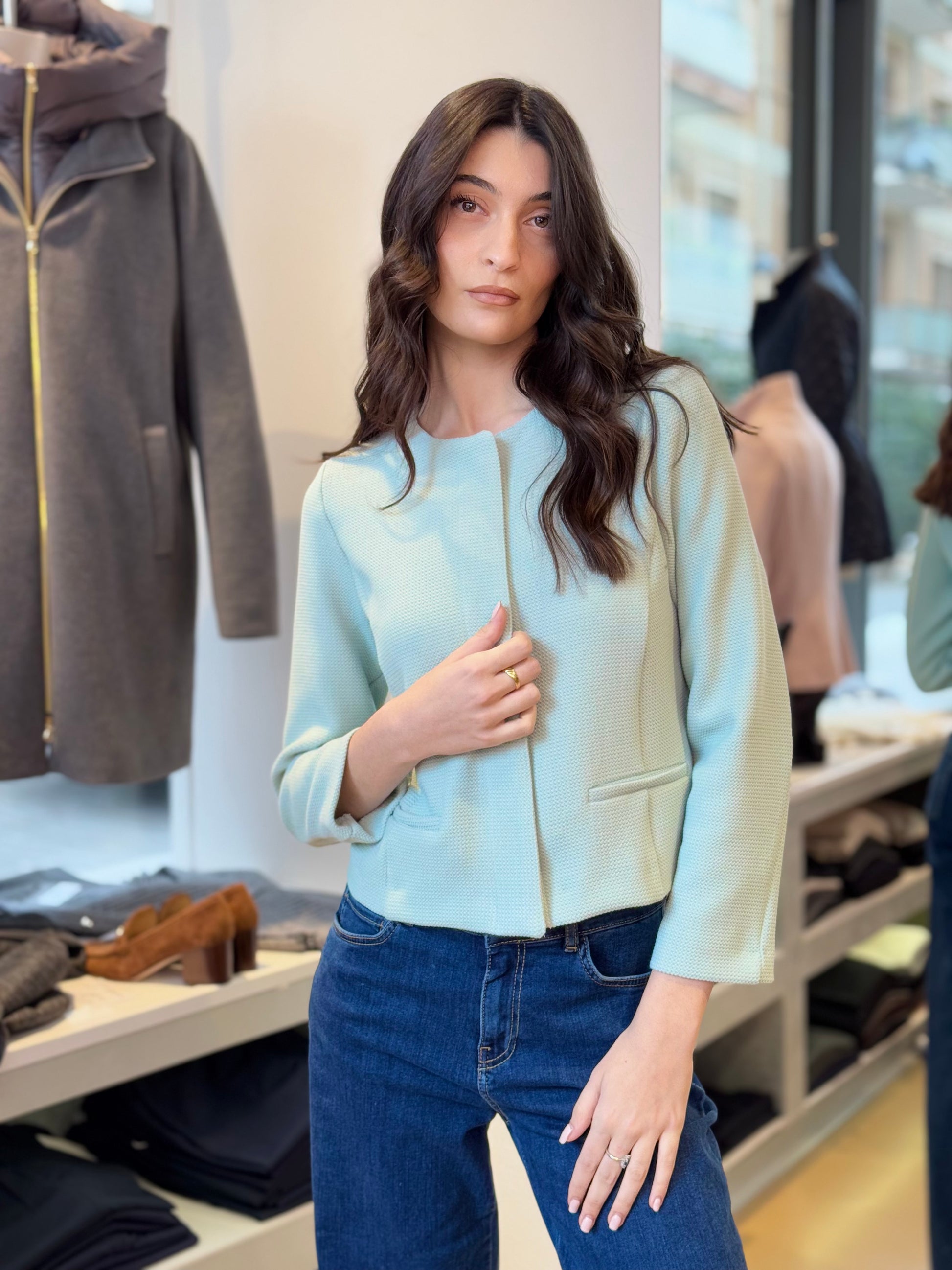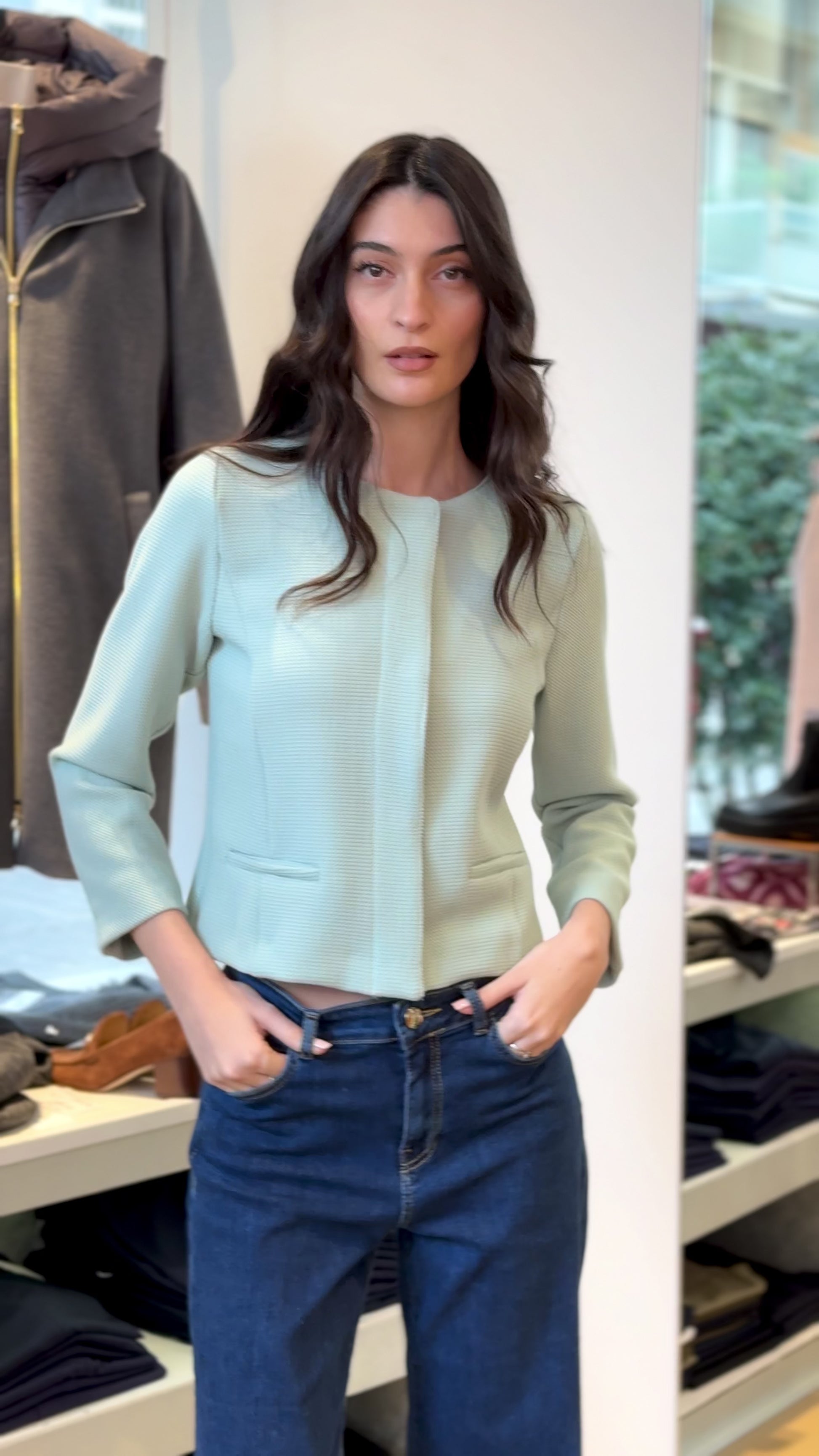 Giacchina verde acqua dal taglio sartoriale e silhouette sfiancata