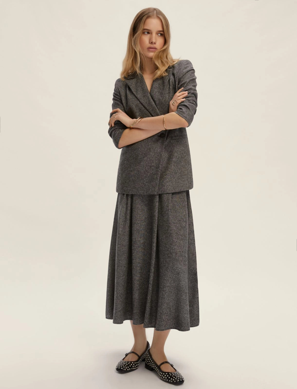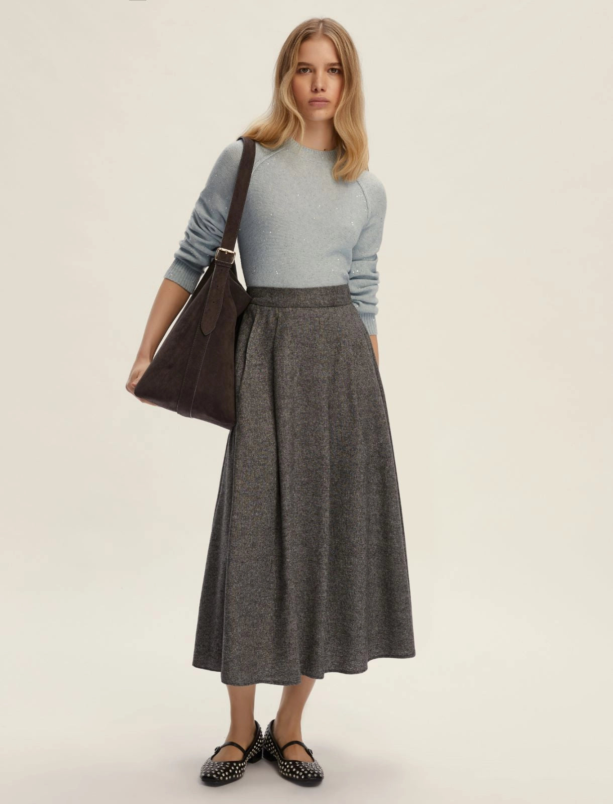 Questa gonna ampia in flanella leggera di misto lana offre un fit svasato che valorizza la figura con eleganza naturale. Il tessuto microfantasia sale e pepe in grigio ardesia assicura un look sofisticato e versatile, ideale per l’ufficio o occasioni casual chic. L’inserto elastico sul retro della vita garantisce comfort e vestibilità su misura, mentre le tasche laterali aggiungono funzionalità senza compromettere lo stile. Perfetta da abbinare al blazer coordinato o a un morbido pullover, questa gonna unisce praticità e femminilità con disinvoltura. Composizione: 40% lana vergine, 30% viscosa, 30% poliestere. Lavare a secco.