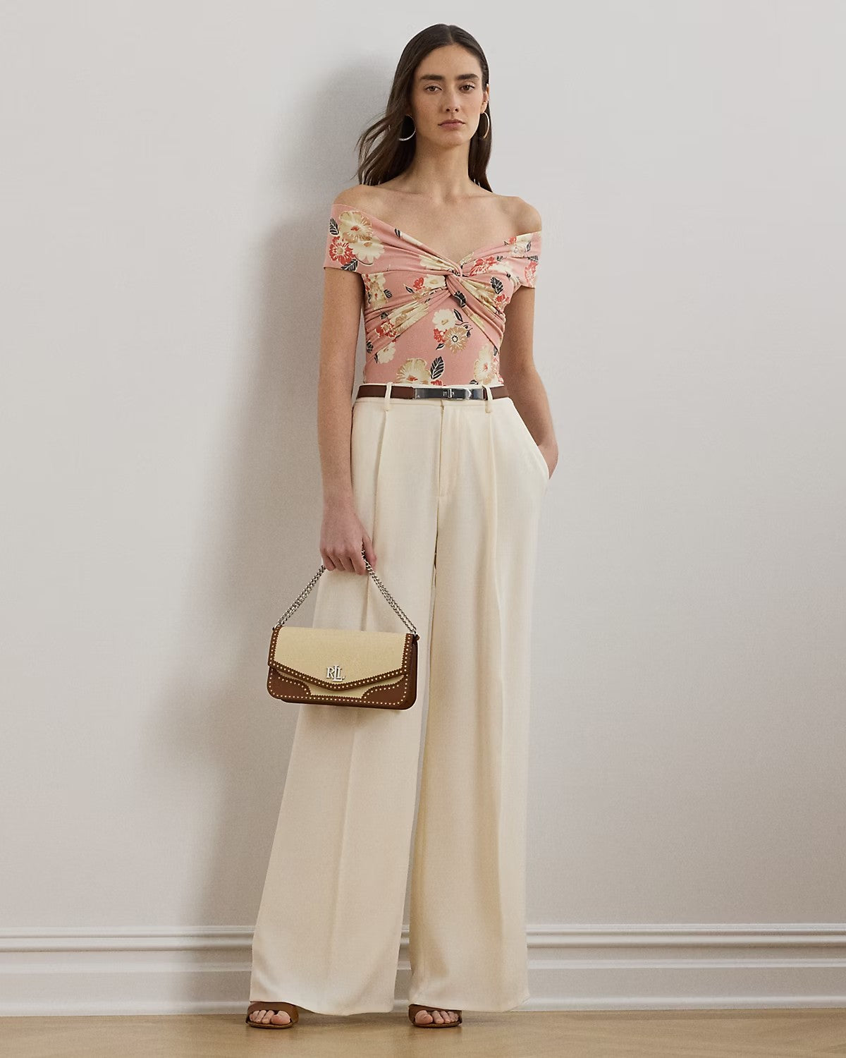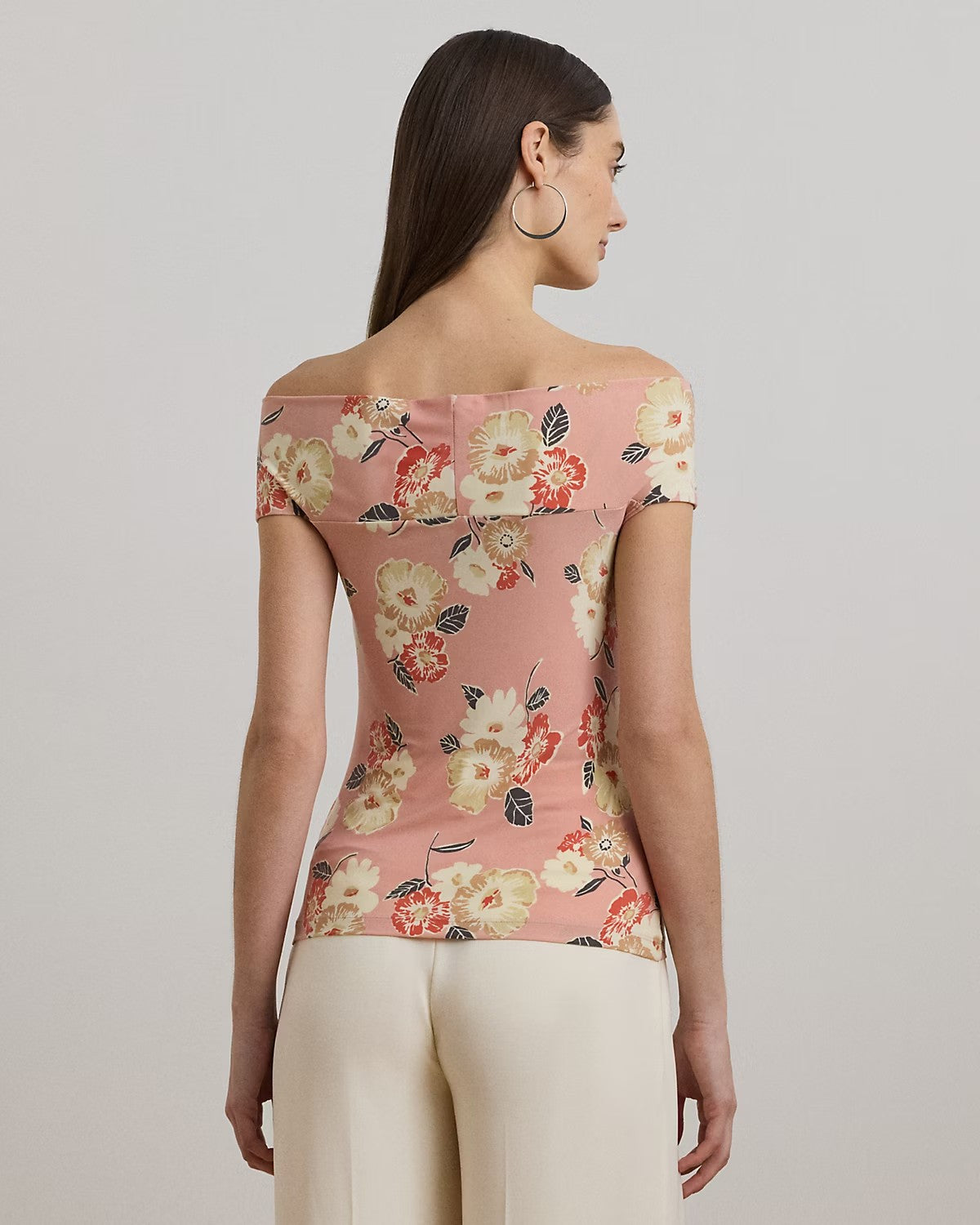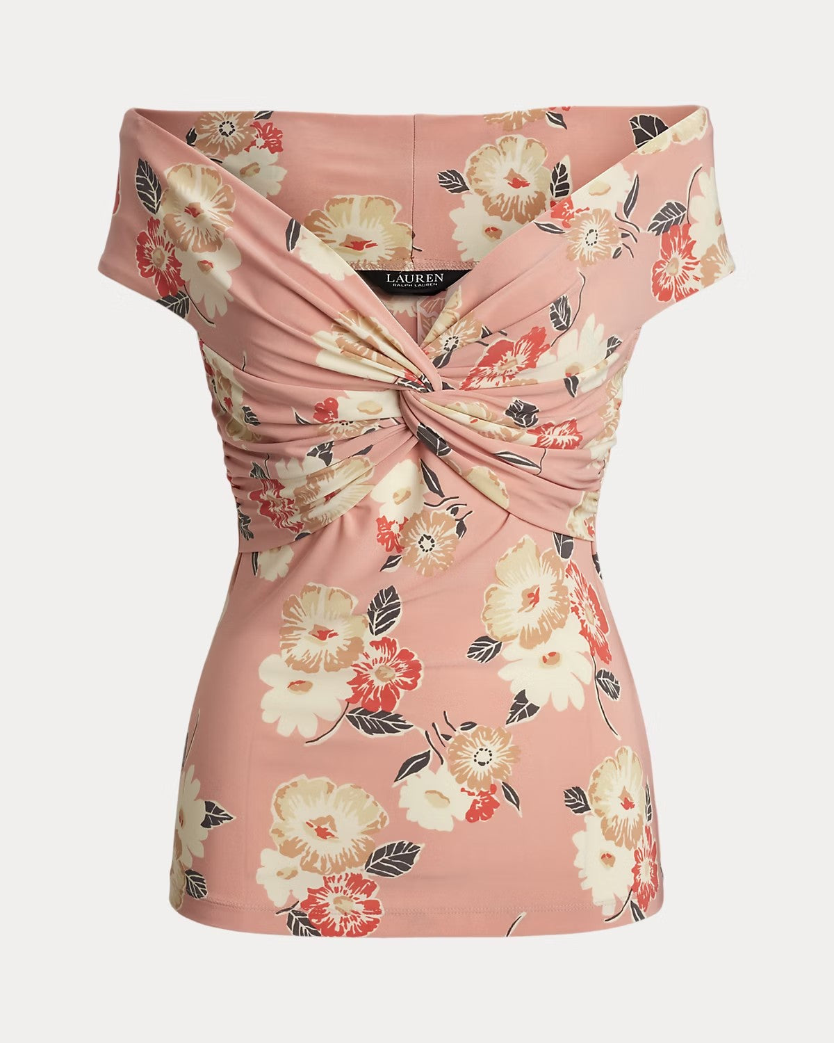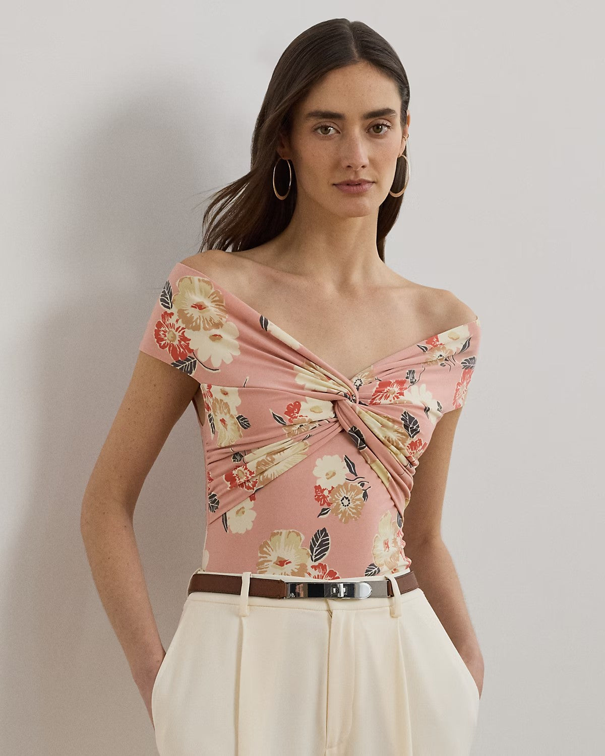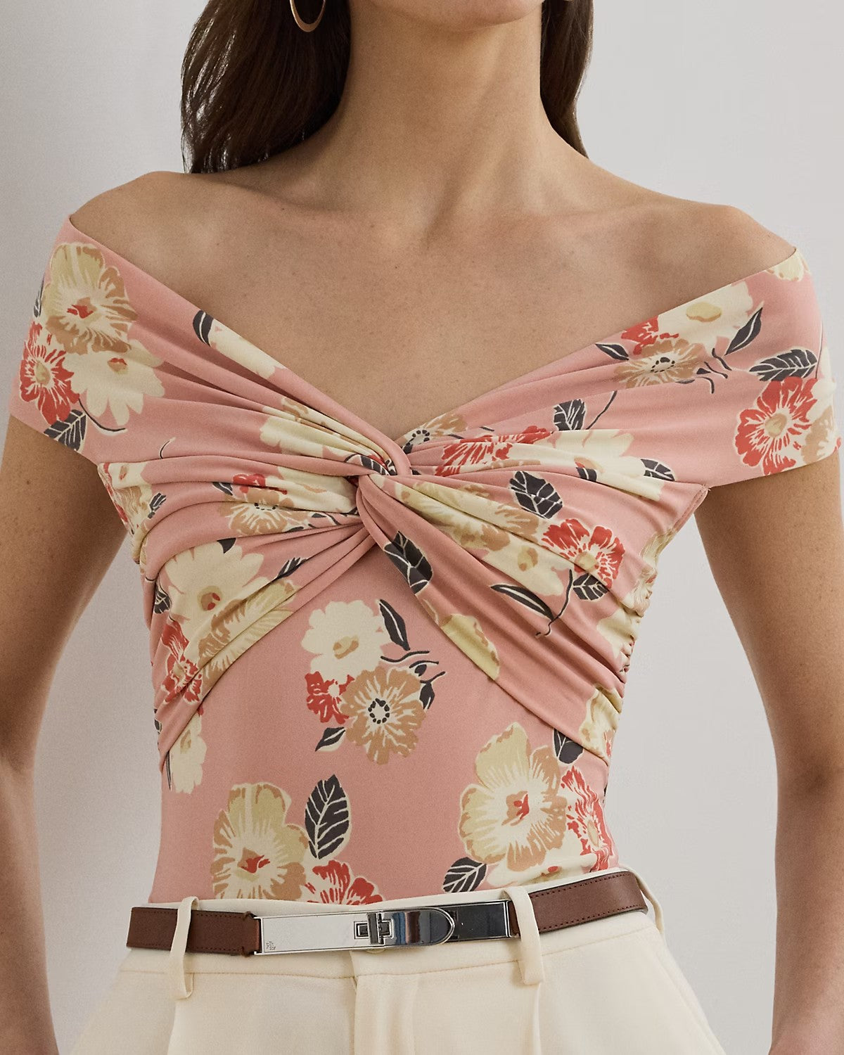 Aggiungi un tocco di eleganza alla tua collezione con la maglia a fiori con dettaglio ritorto. Realizzata in morbido jersey stretch, questa maglia aderente a spalle scoperte è caratterizzata da un motivo floreale stilizzato e un particolare incrocio sul busto che conferiscono un fascino romantico e raffinato.