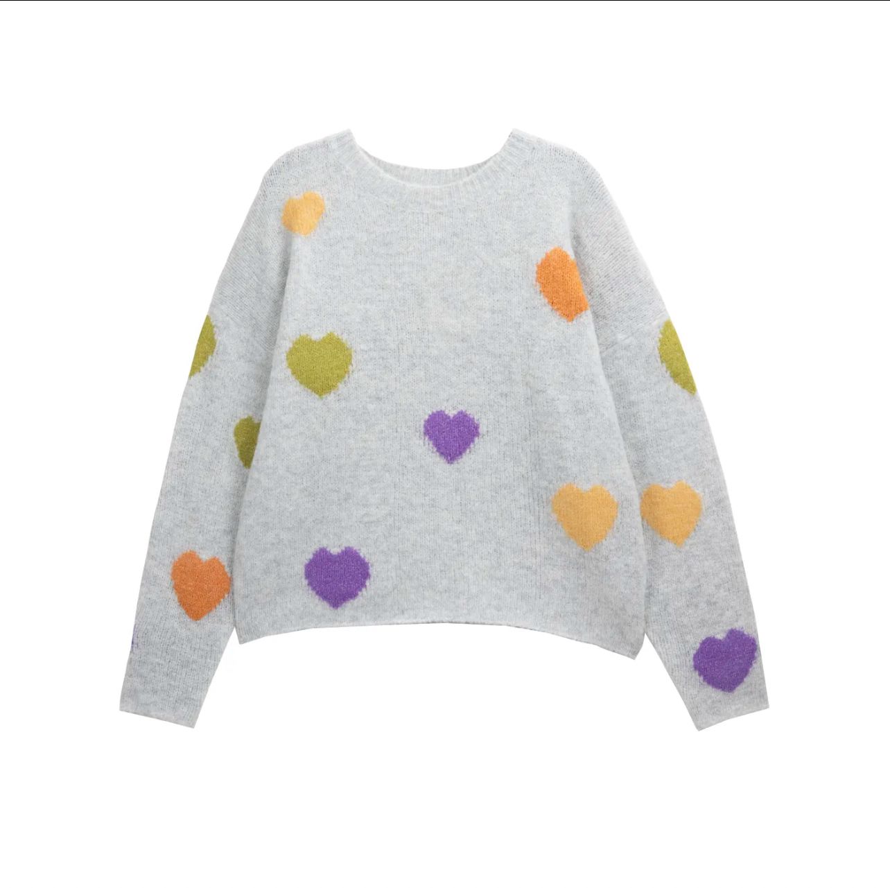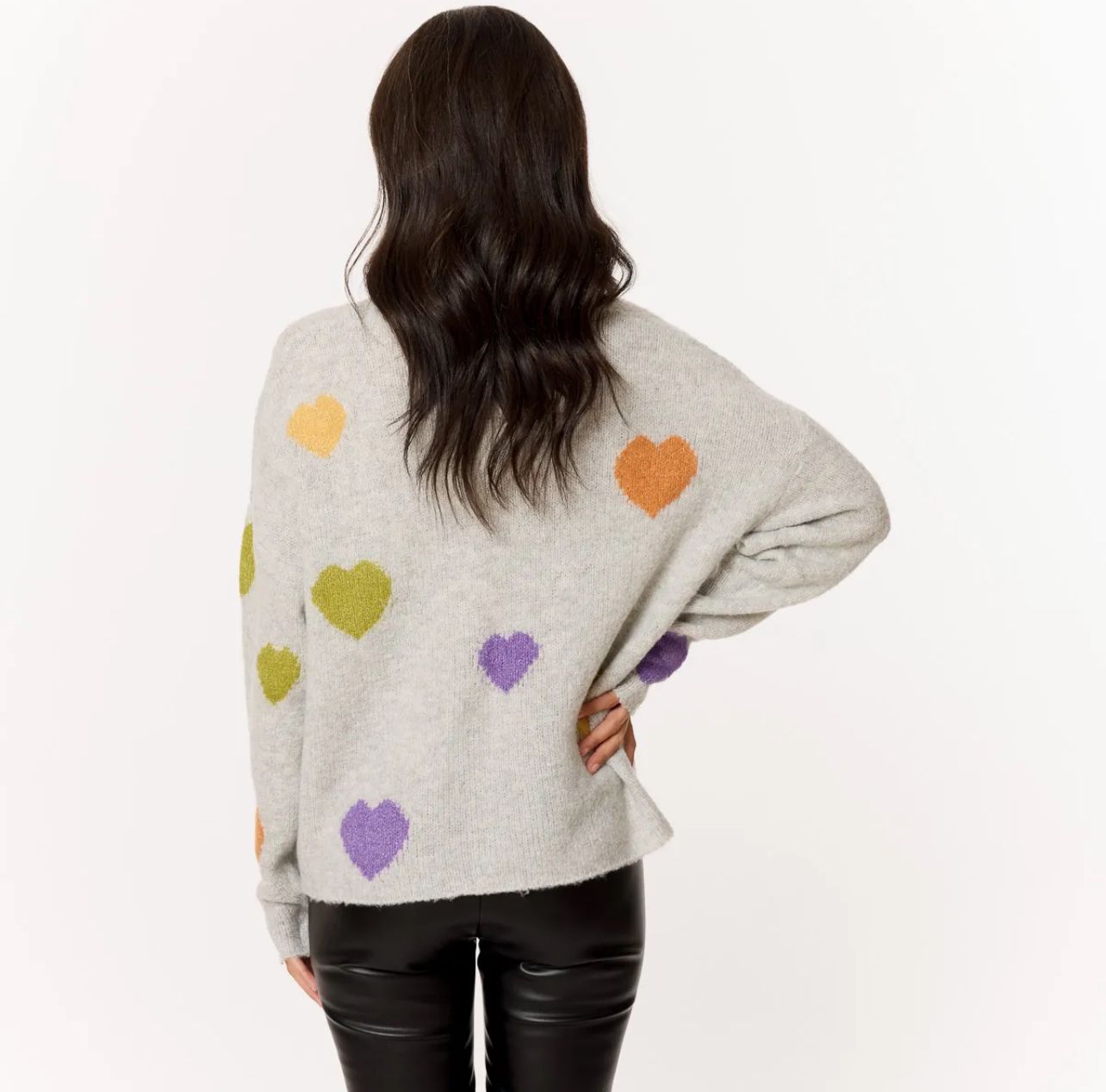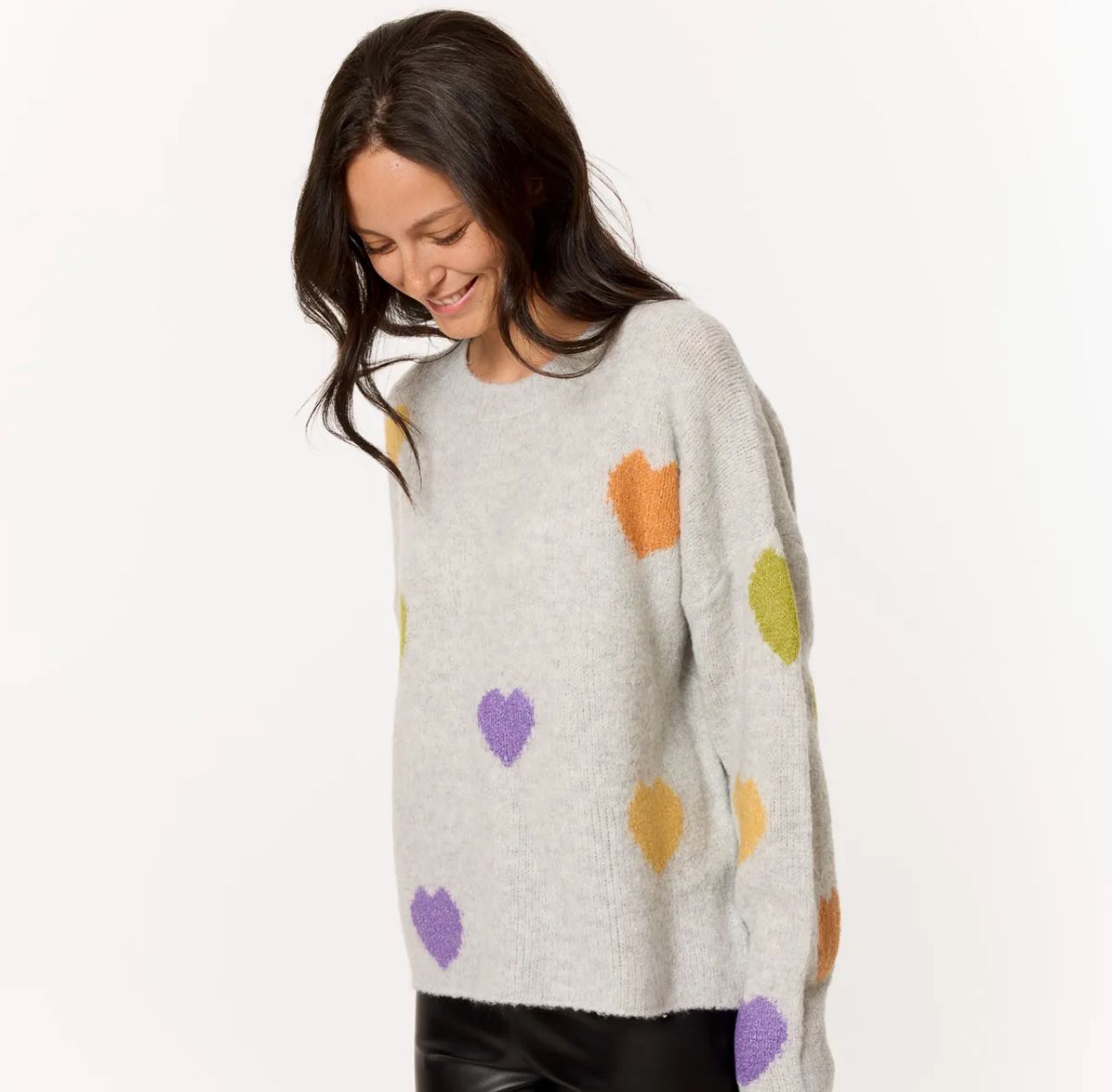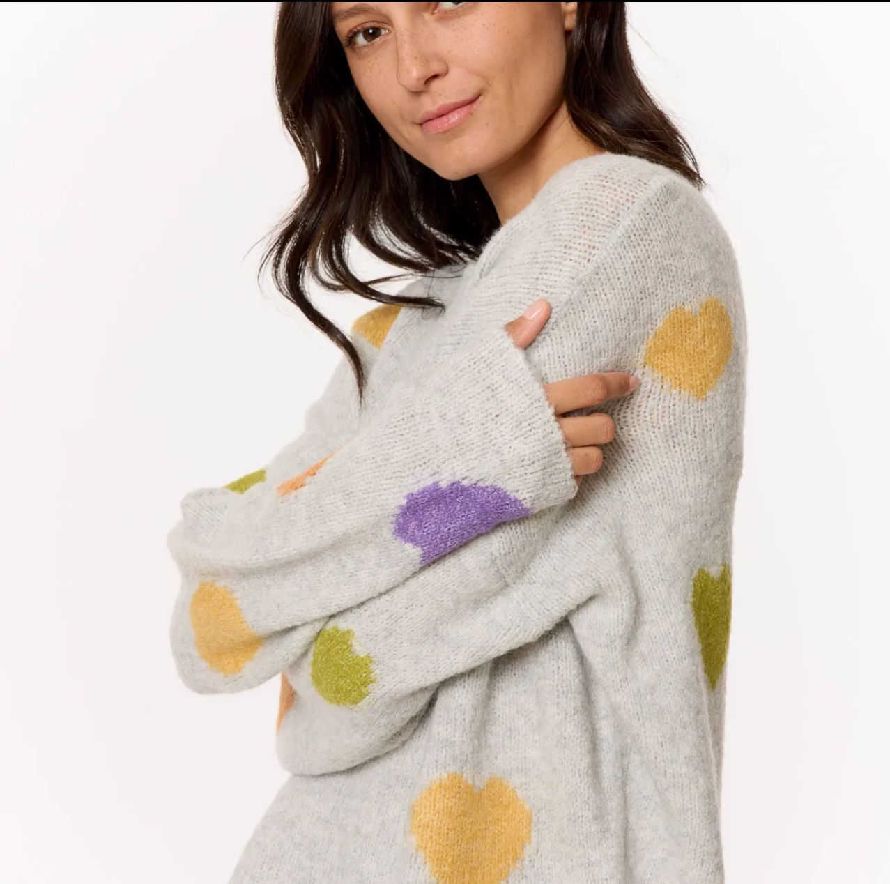 Maglia girocollo oversize del brand Sweewe Paris, caratterizzata da una vivace stampa a cuori colorati su fondo grigio perla. Questo capo dal design moderno e romantico aggiunge un tocco di allegria a ogni look, grazie alla sua vestibilità ampia e comoda. Perfetto per un outfit casual chic, ideale per le giornate più fresche.