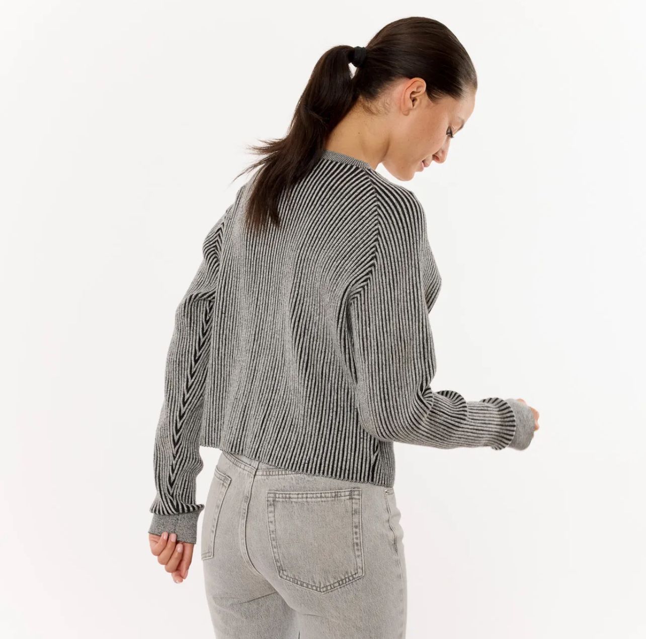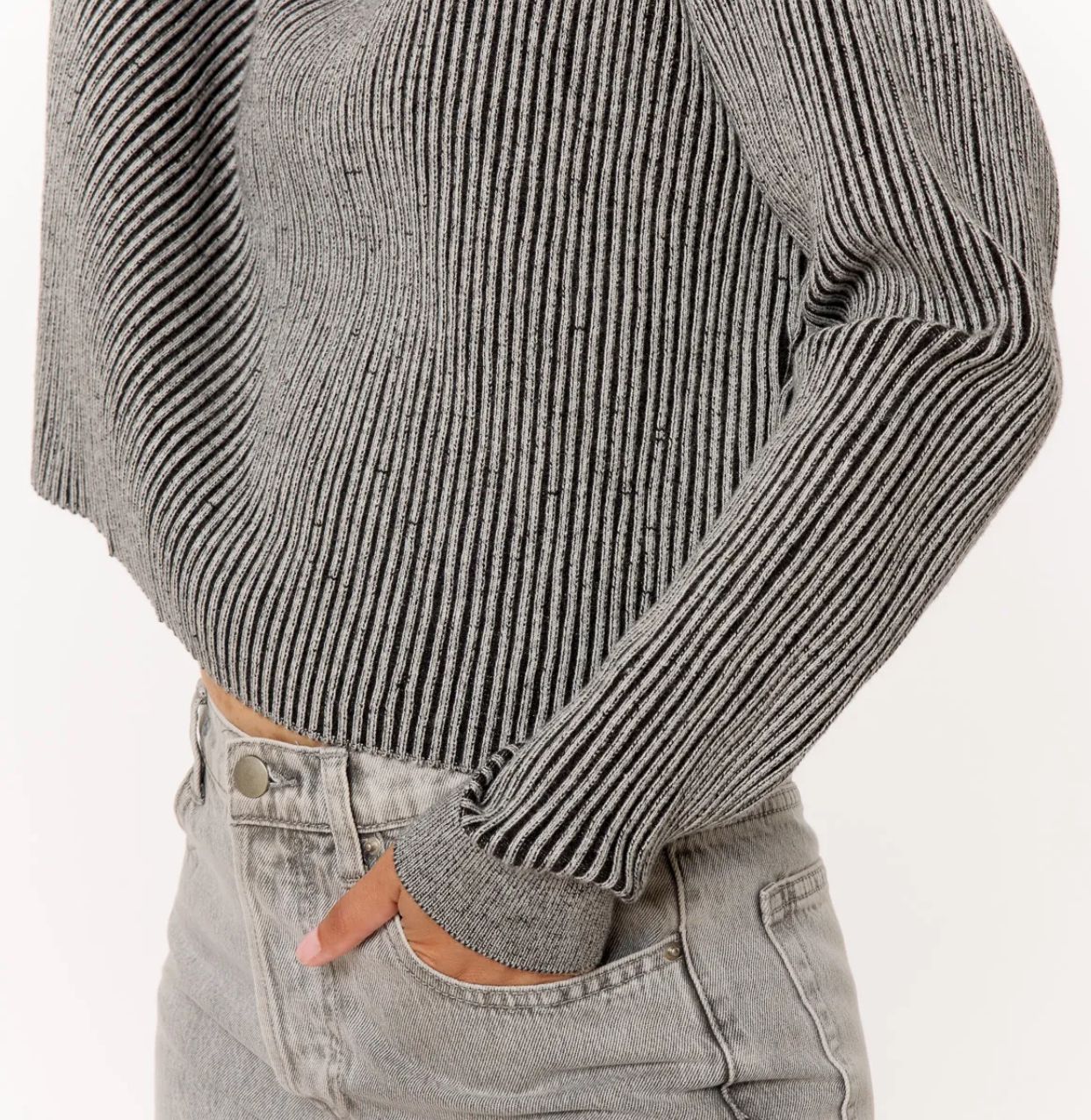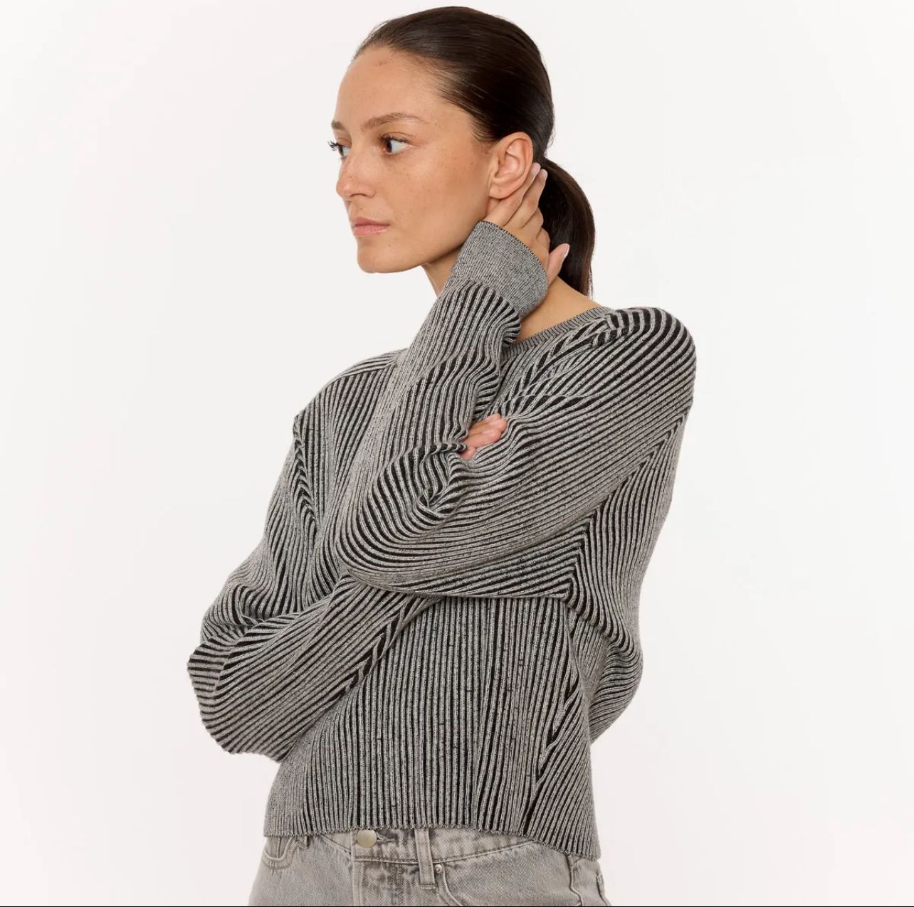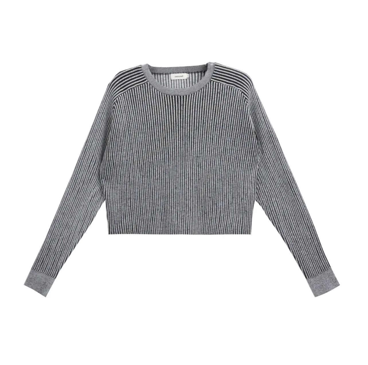 Maglia girocollo a righe grigio e nero del brand Sweewe Paris. Questo capo dal taglio corto e silhouette a scatola offre uno stile contemporaneo e versatile, perfetto per completare outfit casual e raffinati. Realizzata con una lavorazione a coste che garantisce comfort e morbidezza, la maglia combina estetica e praticità.