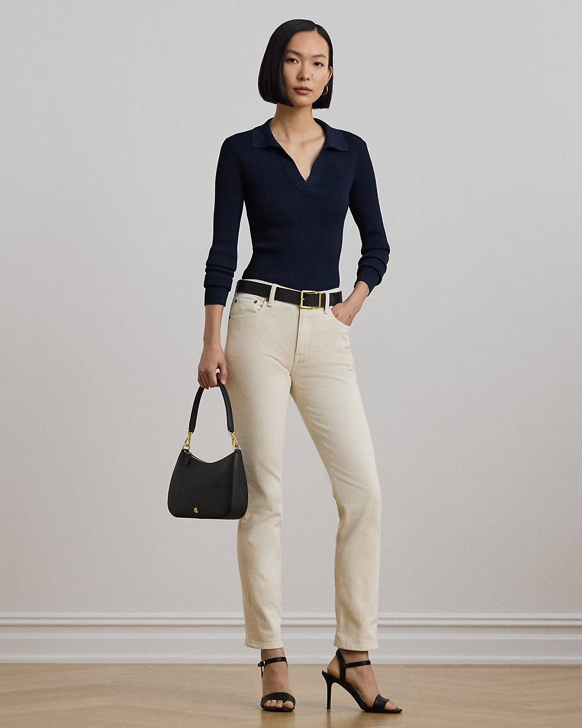 Ispirata alla classica polo di Ralph Lauren, questa maglia a costine con taglio aderente presenta un esclusivo colletto Johnny e un elegante scollo a V. Realizzata in morbida viscosa e nylon, è adatta per ogni occasione. Lunghezza ai fianchi e maniche lunghe. Disponibile in diverse taglie.