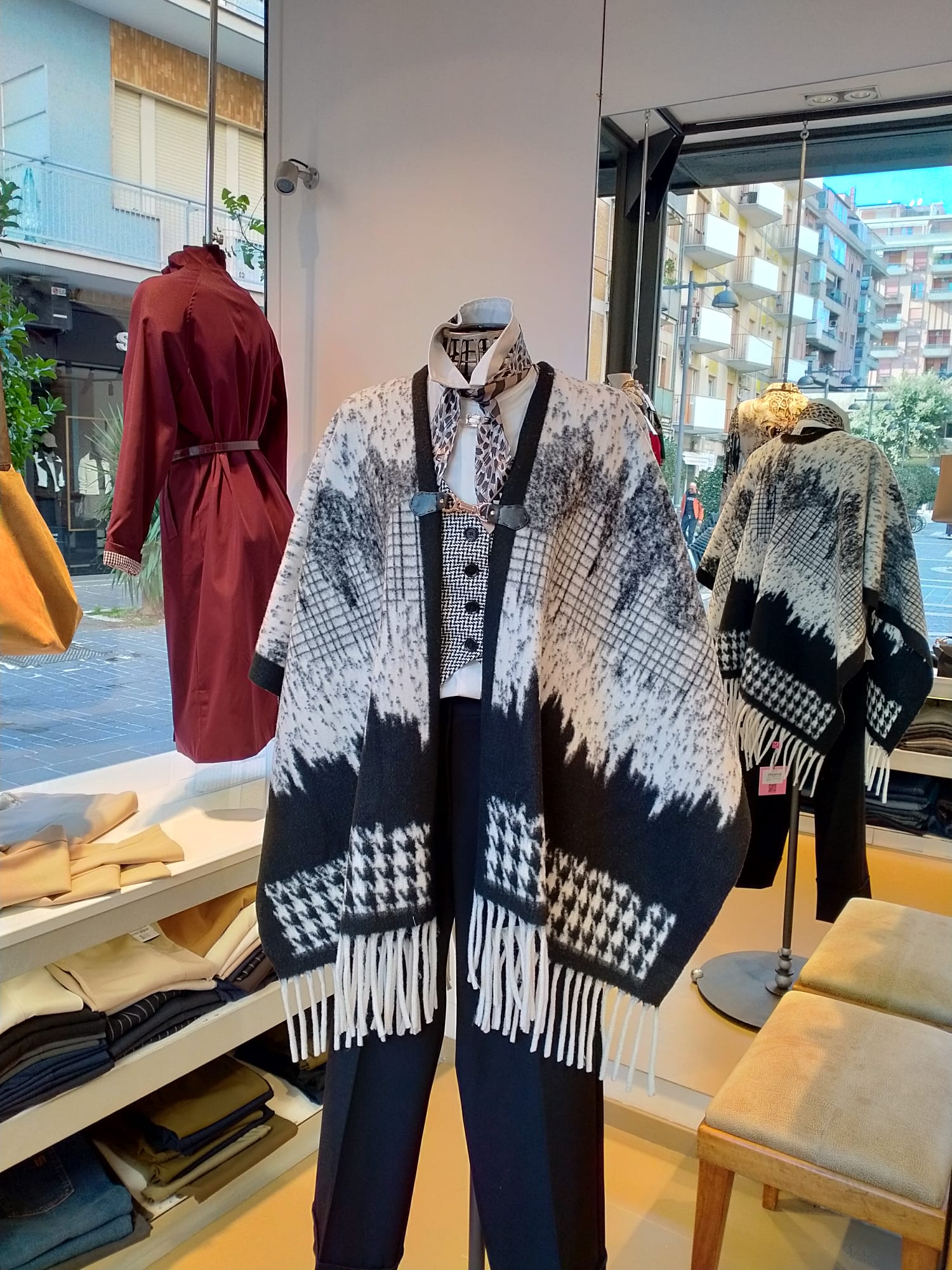 Avvolgiti nell'eleganza di questa magnifica mantella bicolore, un capo d'impatto perfetto per dare un tocco di classe al tuo guardaroba.