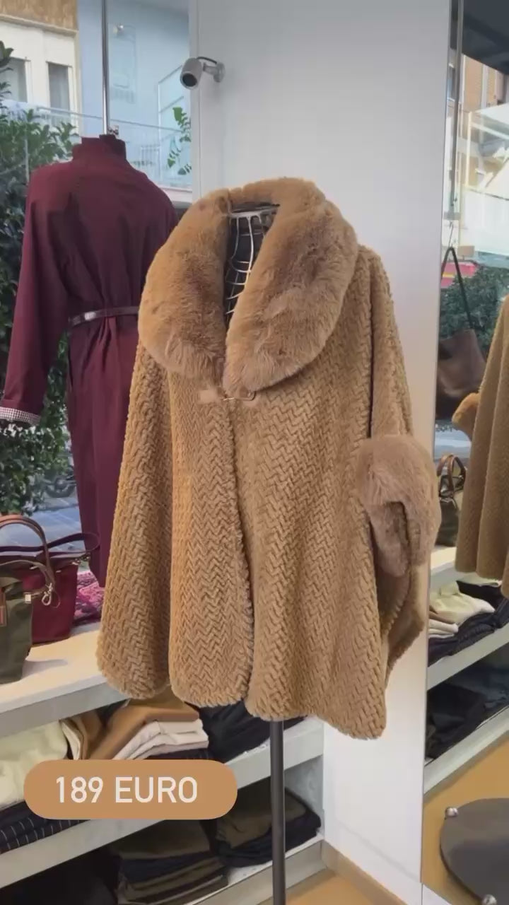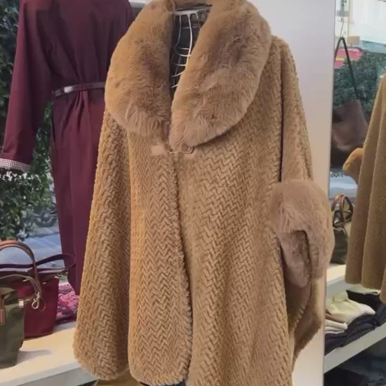 Avvolgiti nel lusso e nel calore con questa splendida mantella in una tonalità calda di cammello/marrone chiaro, perfetta per elevare il tuo stile nelle giornate più fredde.