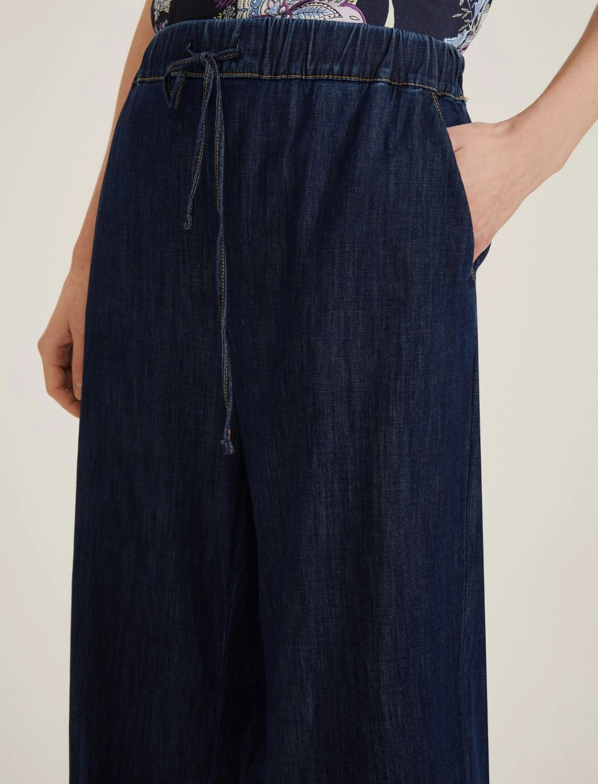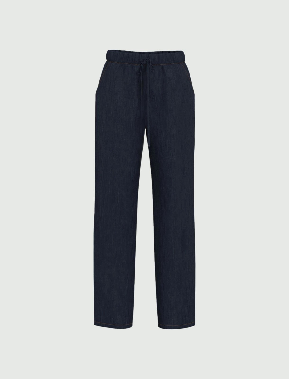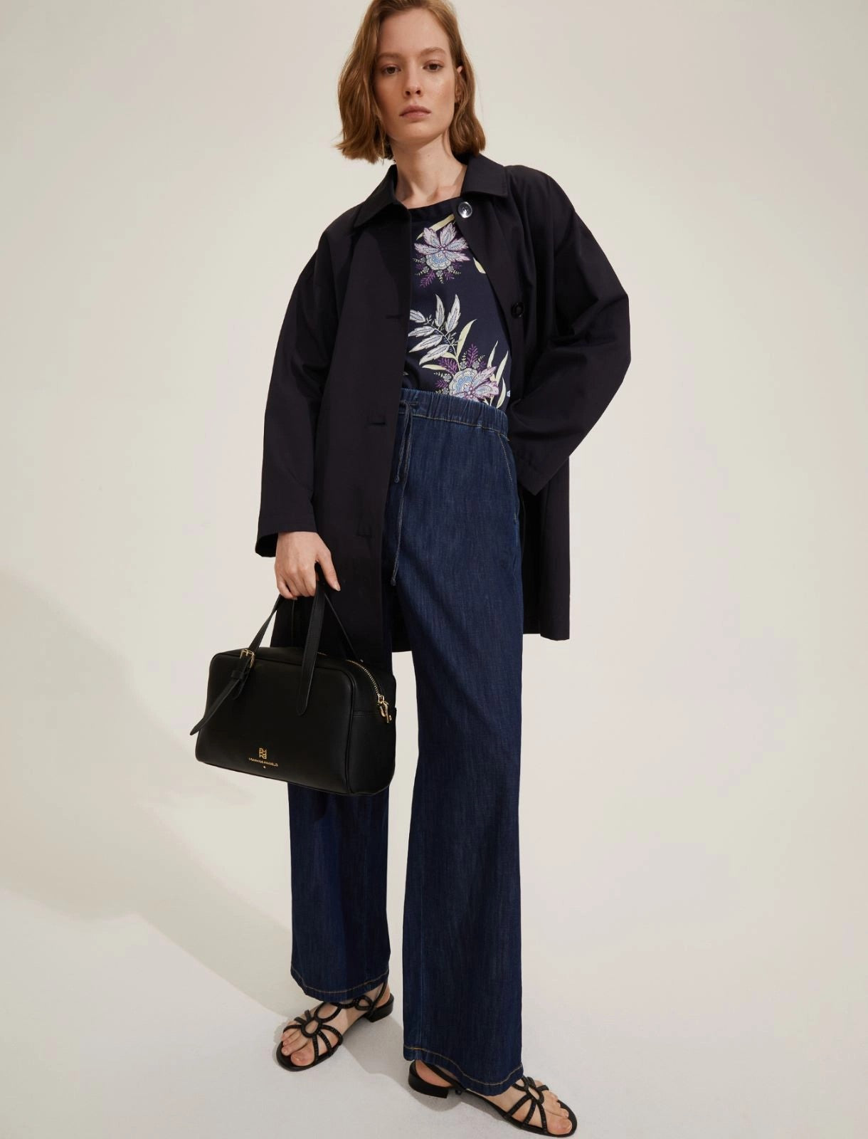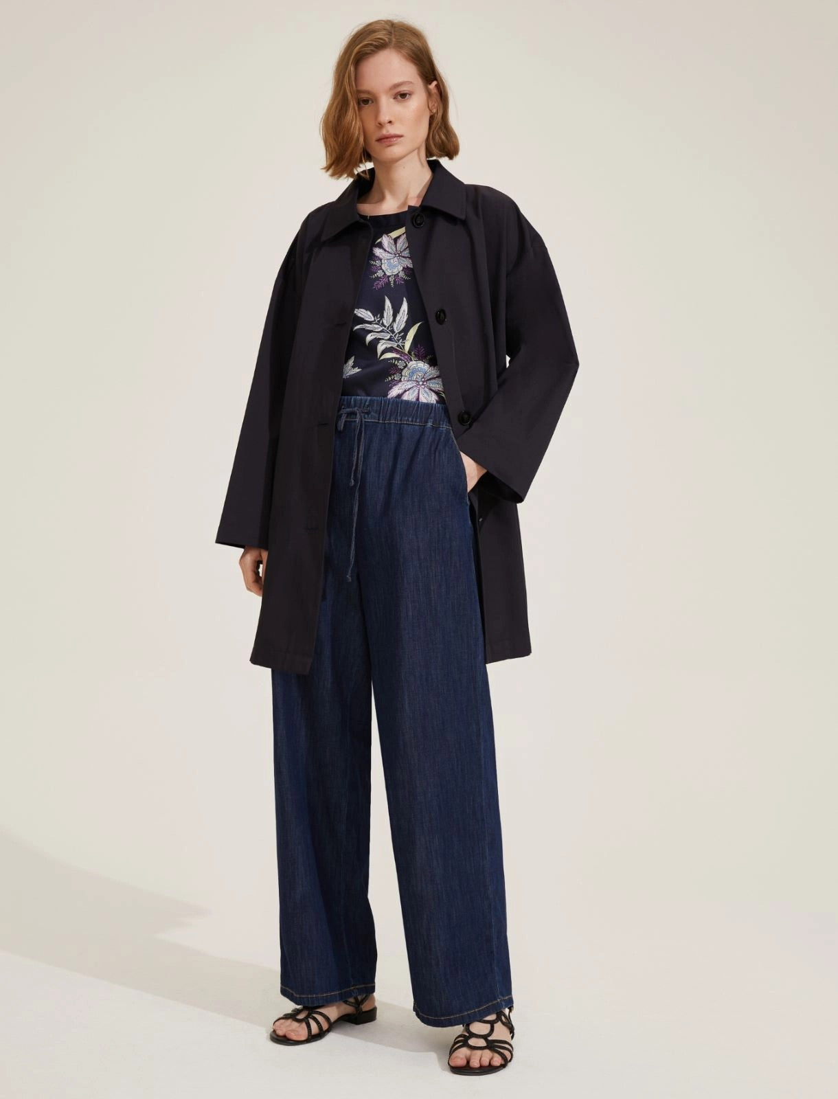 Questo pantalone in denim leggerissimo combina stile e comfort, grazie al suo fit ampio e al dettaglio della coulisse in vita. Le tasche laterali alla francese e l'inserto elastico con arricciature aggiungono un tocco sportivo, mentre le impunture con filo tabacco a contrasto conferiscono un'eleganza sartoriale. Composizione: 99% cotone, 1% elastan. Lavabile in acqua.