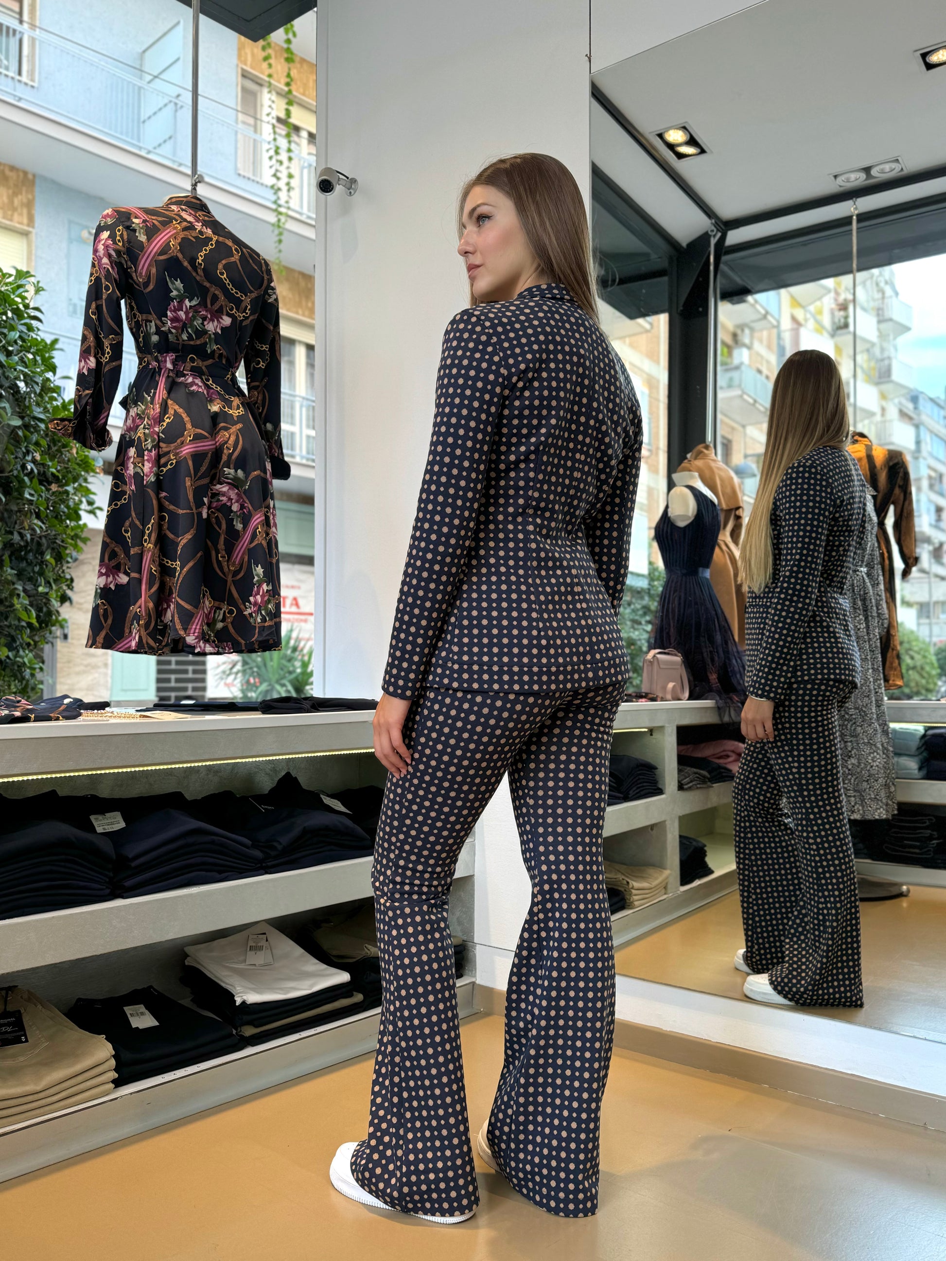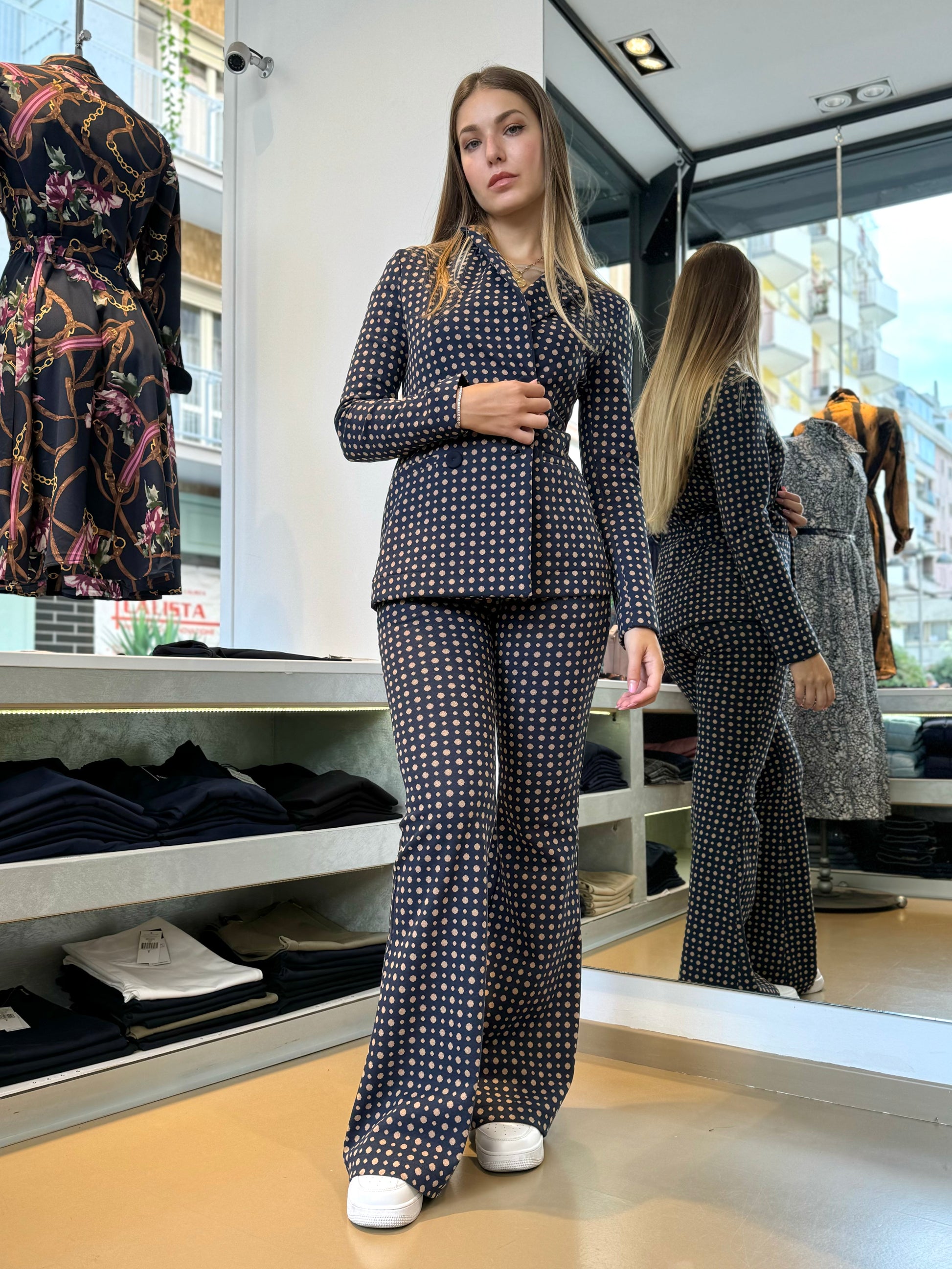 Questa elegante pantalone a zampa è perfetta per un look sofisticato. Realizzato in morbido jersey battuto, presenta un bellissimo motivo a pois e un taglio sagomato che valorizza la figura. Composizione in materiali di alta qualità per un comfort assoluto. Lavabile in acqua per una maggiore praticità. Composizione 53% poliestere, 45% elastan, 3% elastan. Lavabile in acqua.