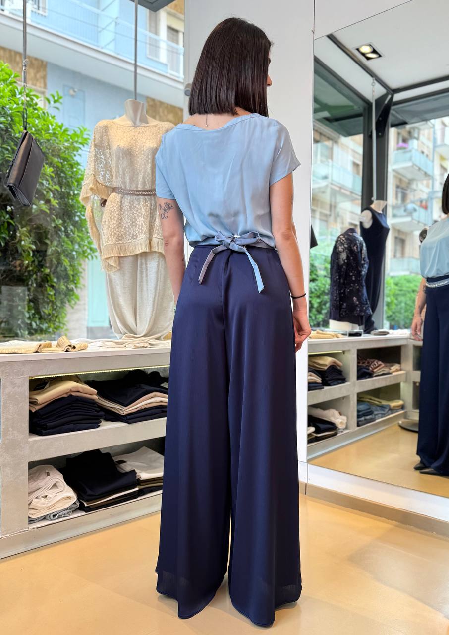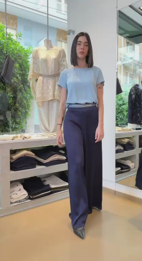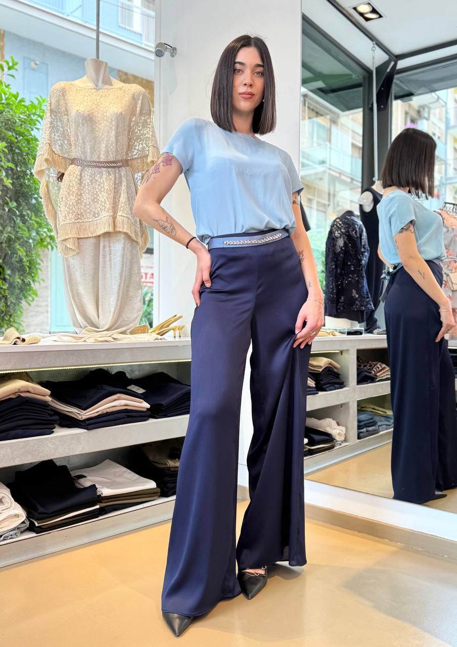 Realizzato in pregiato crêpe lucido con texture zigrinata, questo pantalone palazzo incarna l'eleganza italiana. Il taglio ampio e fluido valorizza la silhouette mentre la chiusura con zip laterale nascosta completa questo capo versatile, perfetto per occasioni formali o per elevare il guardaroba quotidiano con un tocco di sofisticata femminilità. Composizione: 100% poliestere. Lavabile in acqua o a secco. Disponibile anche nel colore nero.