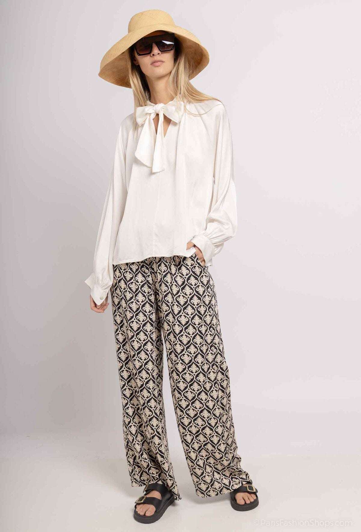 Questi pantaloni a gamba larga con stampa arabesque combinano eleganza e praticità. Realizzati in 100% viscosa, offrono leggerezza e morbidezza, perfetti per chi desidera un capo fresco e raffinato. L’elastico in vita con coulisse decorativa assicura una vestibilità personalizzata, mentre le due tasche aggiungono funzionalità. La taglia unica, che veste dalla 36 alla 46, si adatta a diverse silhouette. Prodotto interamente in Italia, garantisce qualità artigianale e attenzione ai dettagli. Disponibili nei toni beige e nero, sono ideali per un look sofisticato e confortevole.