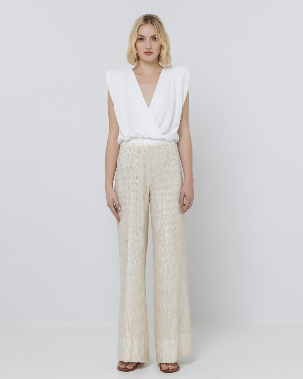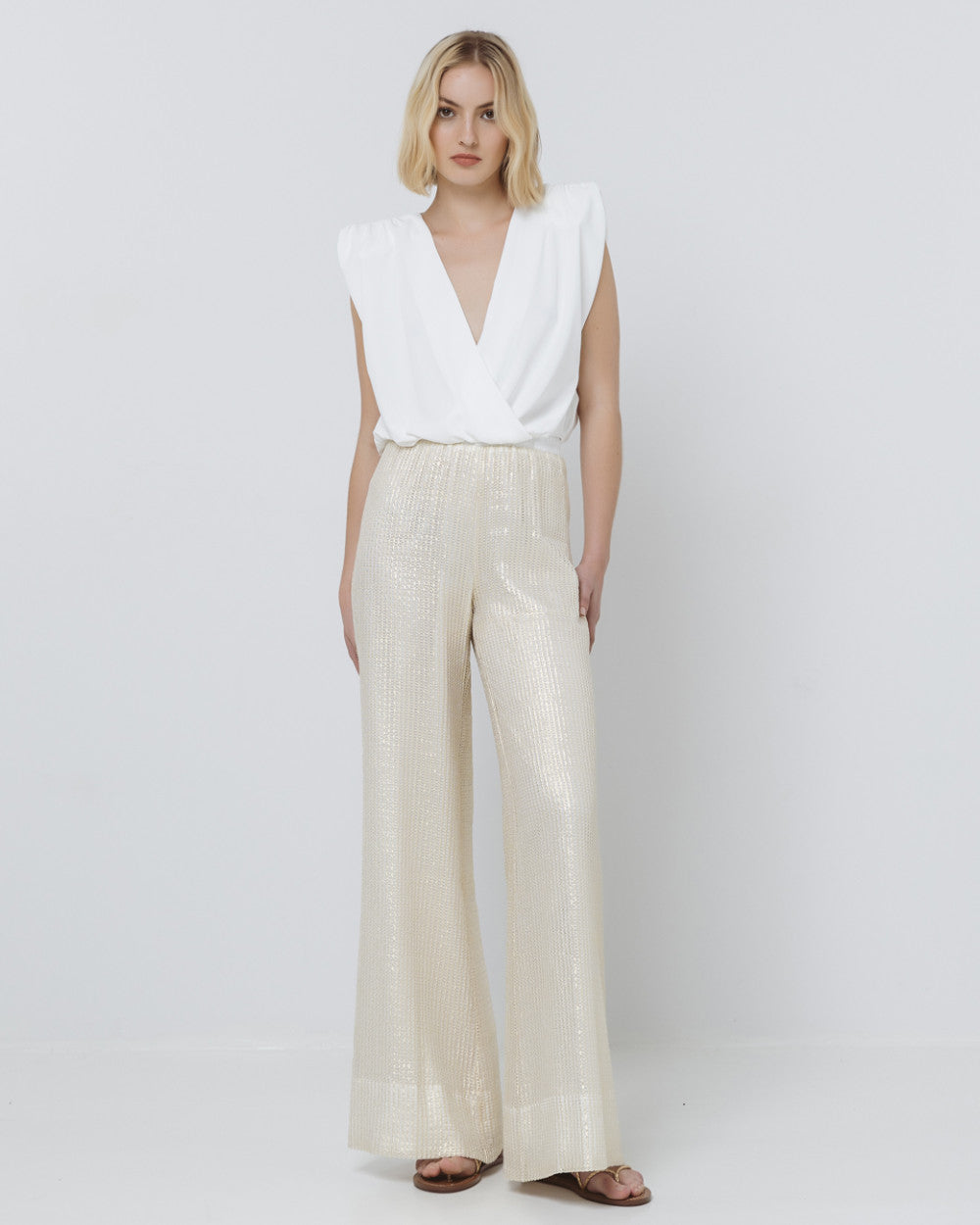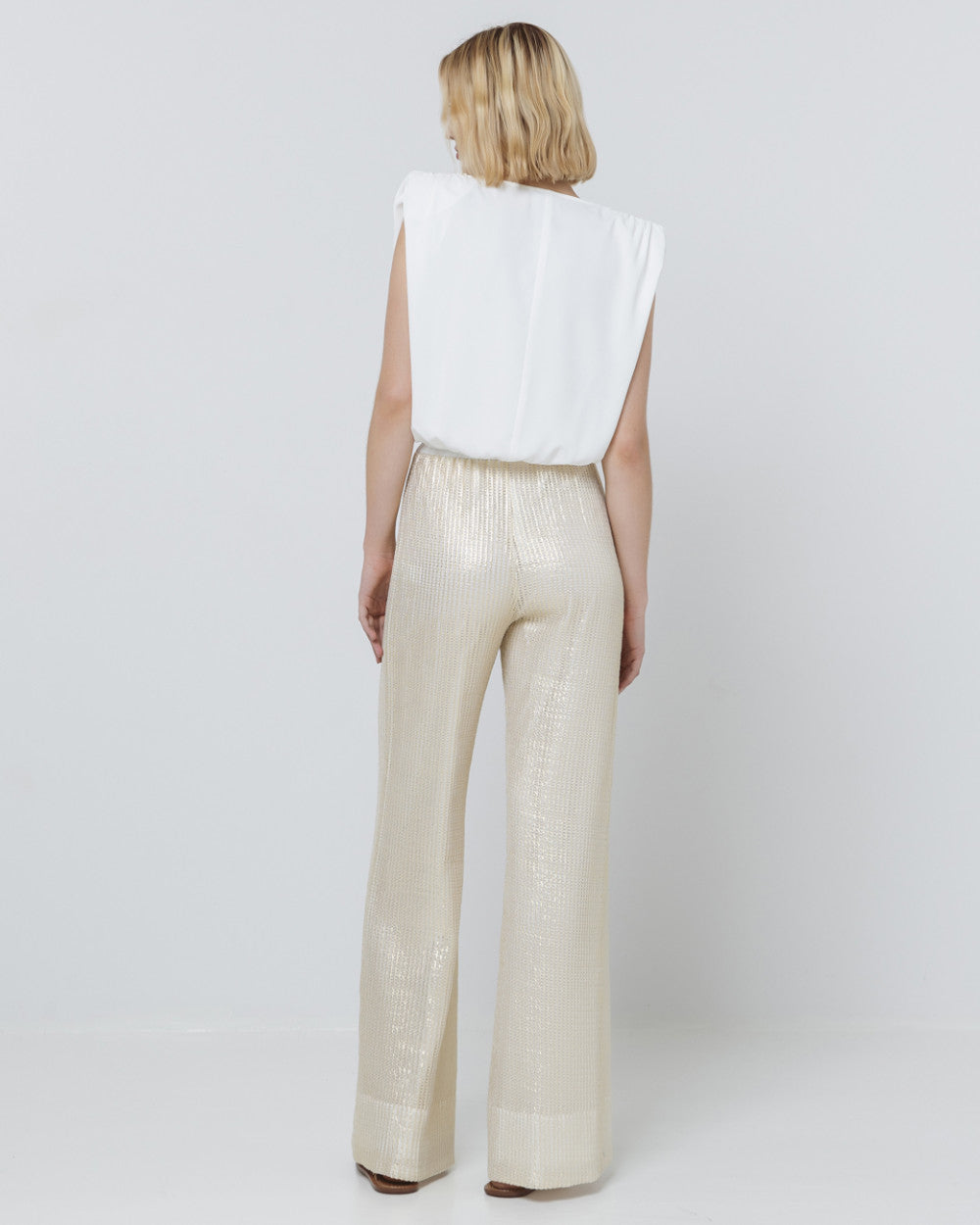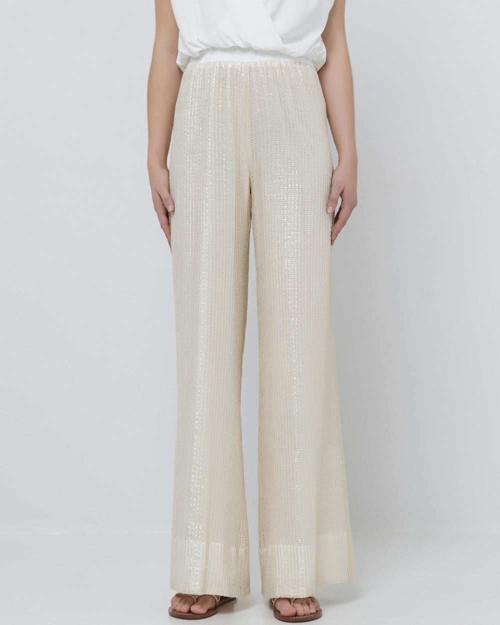 Pantaloni a rete a gamba larga con effetto metallizzato, realizzati in un mix di cotone, poliestere GRS ed elastan per garantire comfort e resistenza. La vita alta con cintura elastica assicura una vestibilità regolare e stabile, mentre la fodera interna offre comfort e copertura. Ideali per creare look sofisticati tono su tono abbinandoli a capi coordinati.