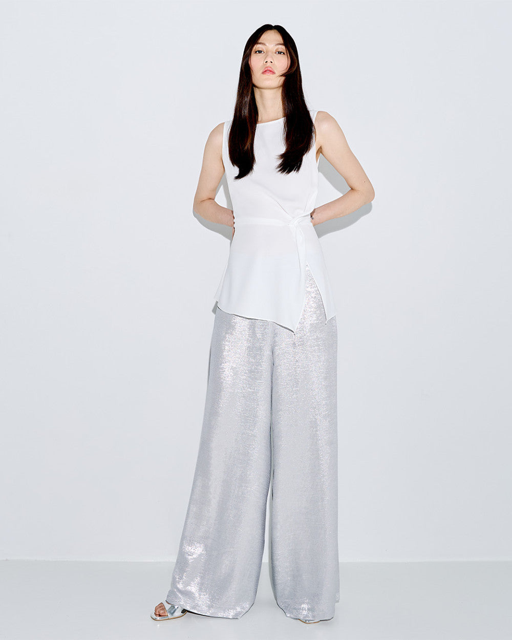 Entra nell'atmosfera glamour con i nostri pantaloni effetto metallizzato. Il nostro modello indossa pantaloni a gamba larga con elastico in vita e una cerniera laterale per una vestibilità perfetta.