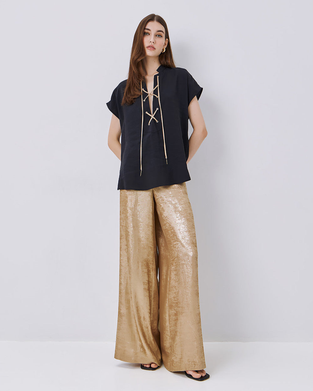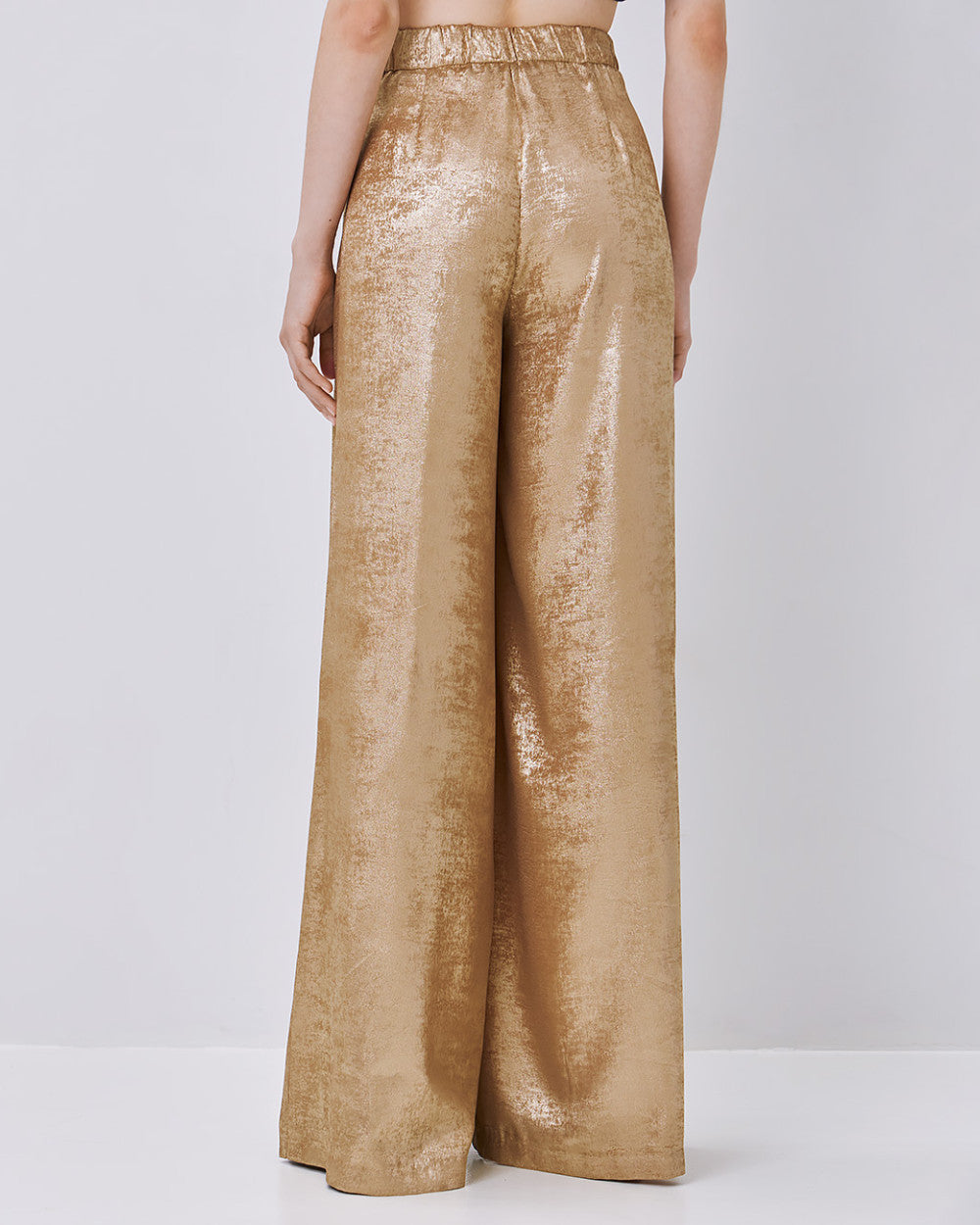 Entra nell'atmosfera glamour con i nostri pantaloni effetto metallizzato. La nostra modella indossa pantaloni a gamba larga con elastico in vita e una cerniera laterale per una vestibilità perfetta.