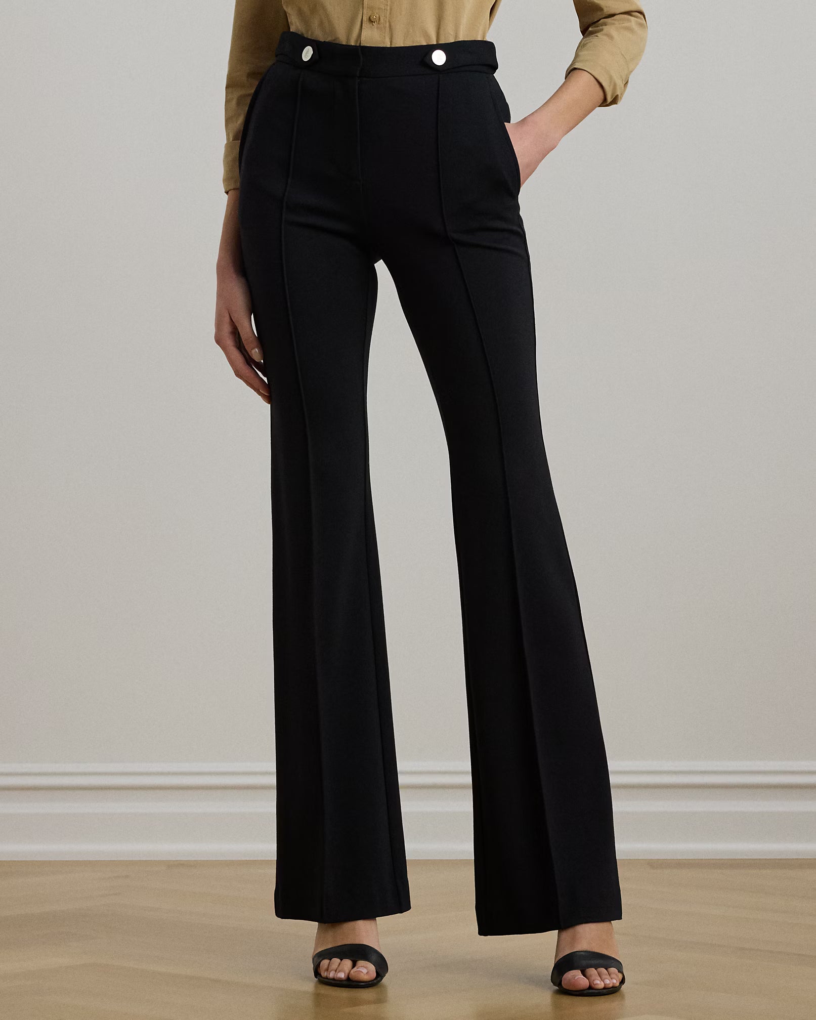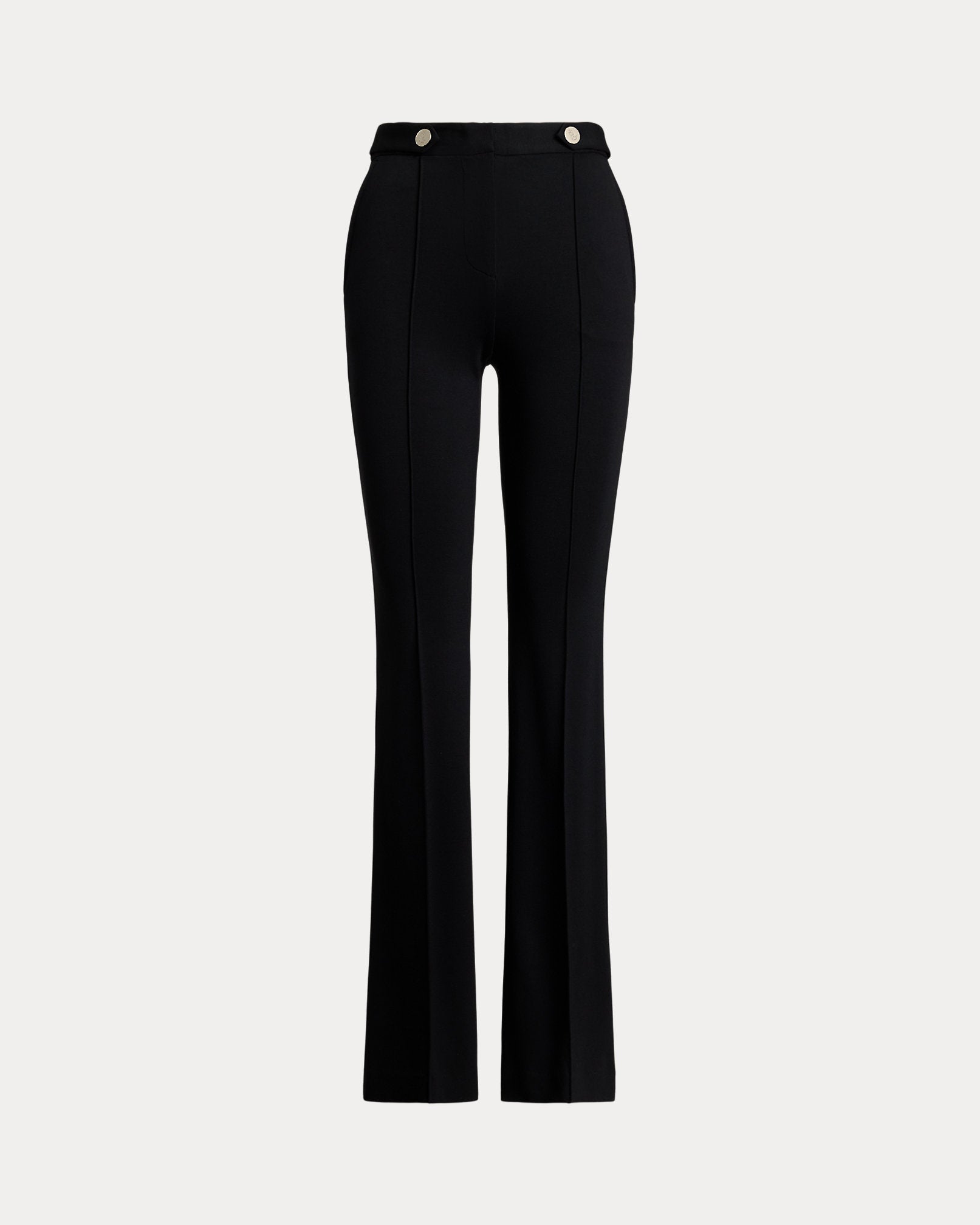 Questi pantaloni in doppio jersey con leggera zampa sono dotati di patta con cerniera e chiusura a gancetto per una vestibilità sicura e raffinata. Presentano un bottone interno e due listini frontali con automatico in vita, mentre gli esclusivi automatici in metallo con logo "LRL" conferiscono un tocco distintivo e di alta qualità al capo. Una scelta ideale per chi cerca stile ed eleganza nei dettagli. Vita media, Due tasche di sbieco in vita sul davanti. Due tasche a filetto in vita sul retro. Pieghe lungo la parte anteriore e posteriore di ciascuna gamba. Pieghe in vita sul retro. 65% viscosa, 29% nylon, 6% elastan. Lavabile in lavatrice o a secco.