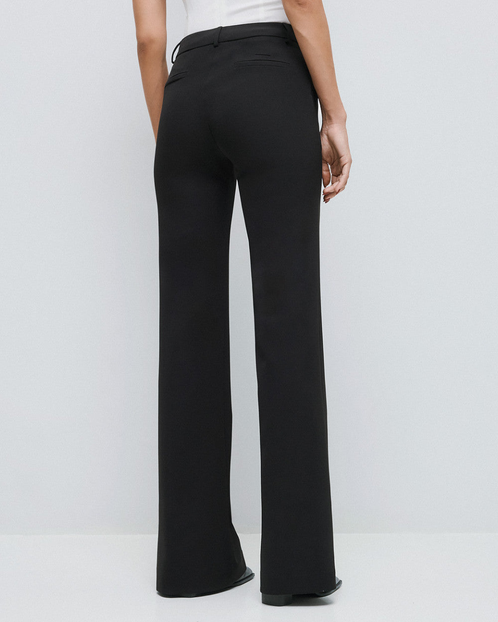 Questi pantaloni neri a zampa, realizzati in tessuto tecnico composto per l’87% da poliestere riciclato e 13% spandex, offrono una vestibilità regolare con vita alta, garantendo comfort e sostegno durante tutto il giorno. Il tessuto stabile e leggermente fiammato conferisce struttura ed eleganza, ideale per outfit formali da giorno. Dotati di tasche laterali funzionali e tasche posteriori decorative a filetto, sono rifiniti con passanti per cintura e una chiusura frontale con cerniera e bottone, unendo praticità e stile senza compromessi.