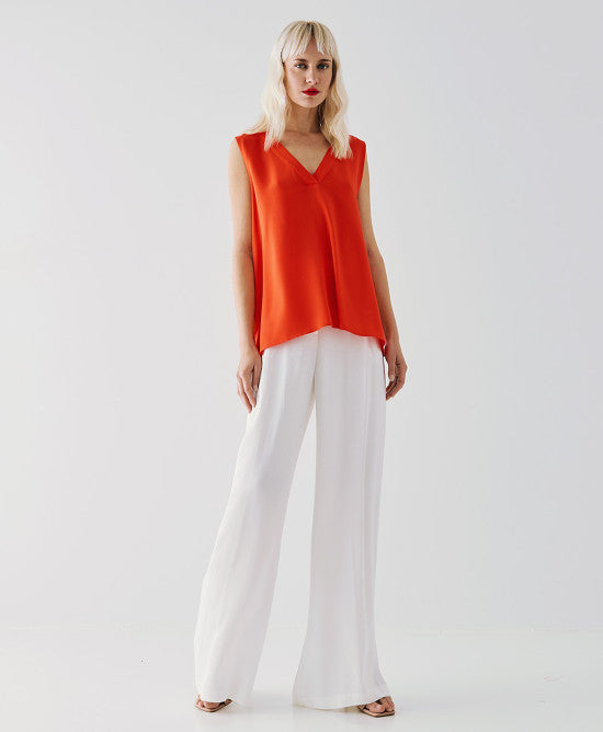 Lasciati sedurre dal colore più iconico con la nostra blusa smanicata in un audace rosso arancio. Un capo che parla di energia e di carattere, realizzato in 100% rayon per garantirti una leggerezza e una fluidità che ti faranno sentire a tuo agio, sempre.