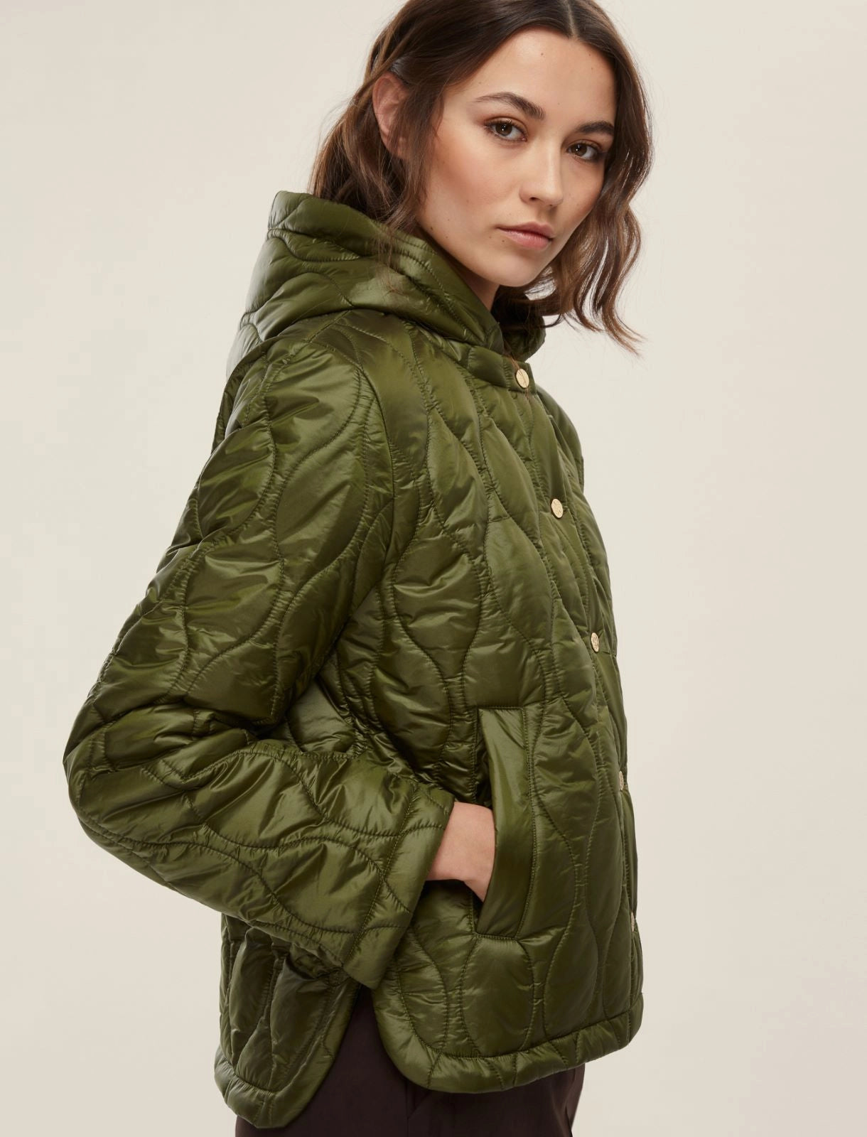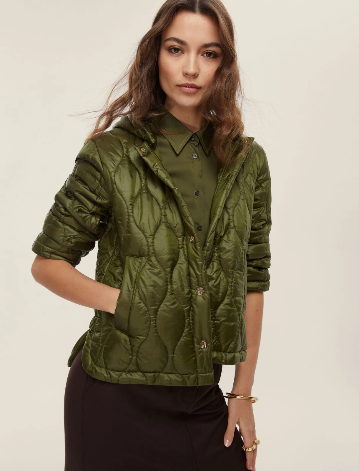 Questo piumino leggero da 100 grammi unisce protezione e stile pratico, ideale per le stagioni di transizione. Realizzato in tessuto tecnico antigoccia e downproof, difende efficacemente da aria e pioggia primaverile. Il fit dritto e il collo stondato con cappuccio staccabile garantiscono comfort e versatilità, mentre la trapuntatura ondulata conferisce una texture elegante. I bottoni a pressione personalizzati e i fondi asimmetrici completano un capo raffinato, pensato per accompagnarti con funzionalità e design in ogni occasione. Disponibile in verde militare o marrone. Tessuto 100% poliammide; fodera 100% poliammide; con imbottitura in 100% poliestere. Lavabile in acqua o a secco.
