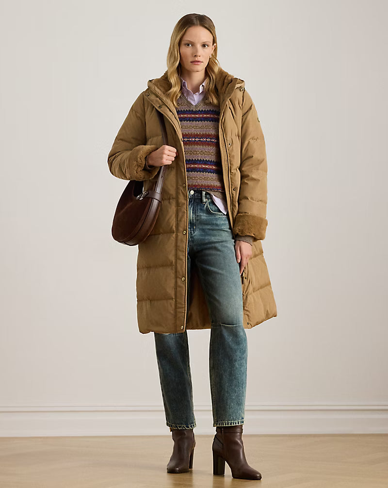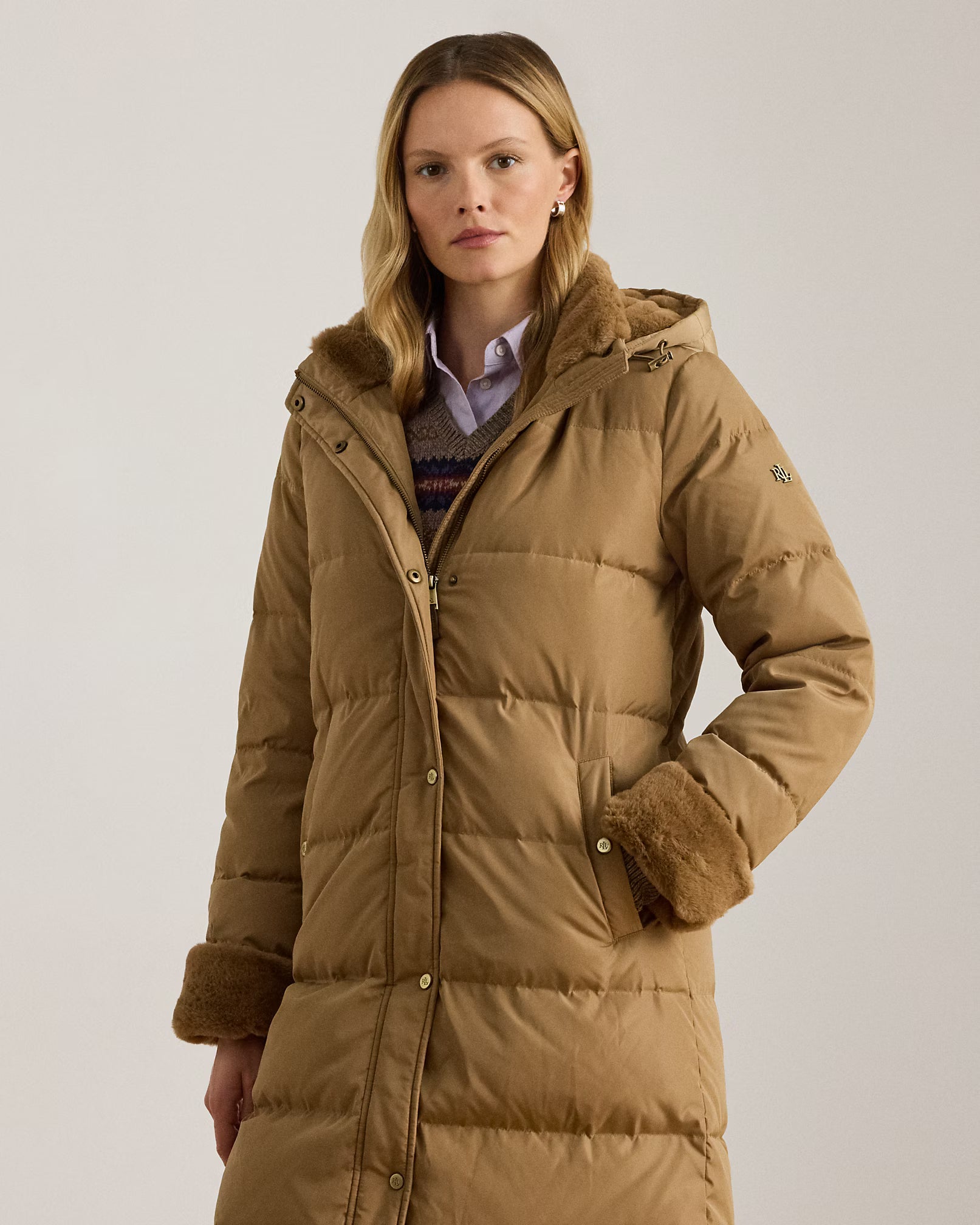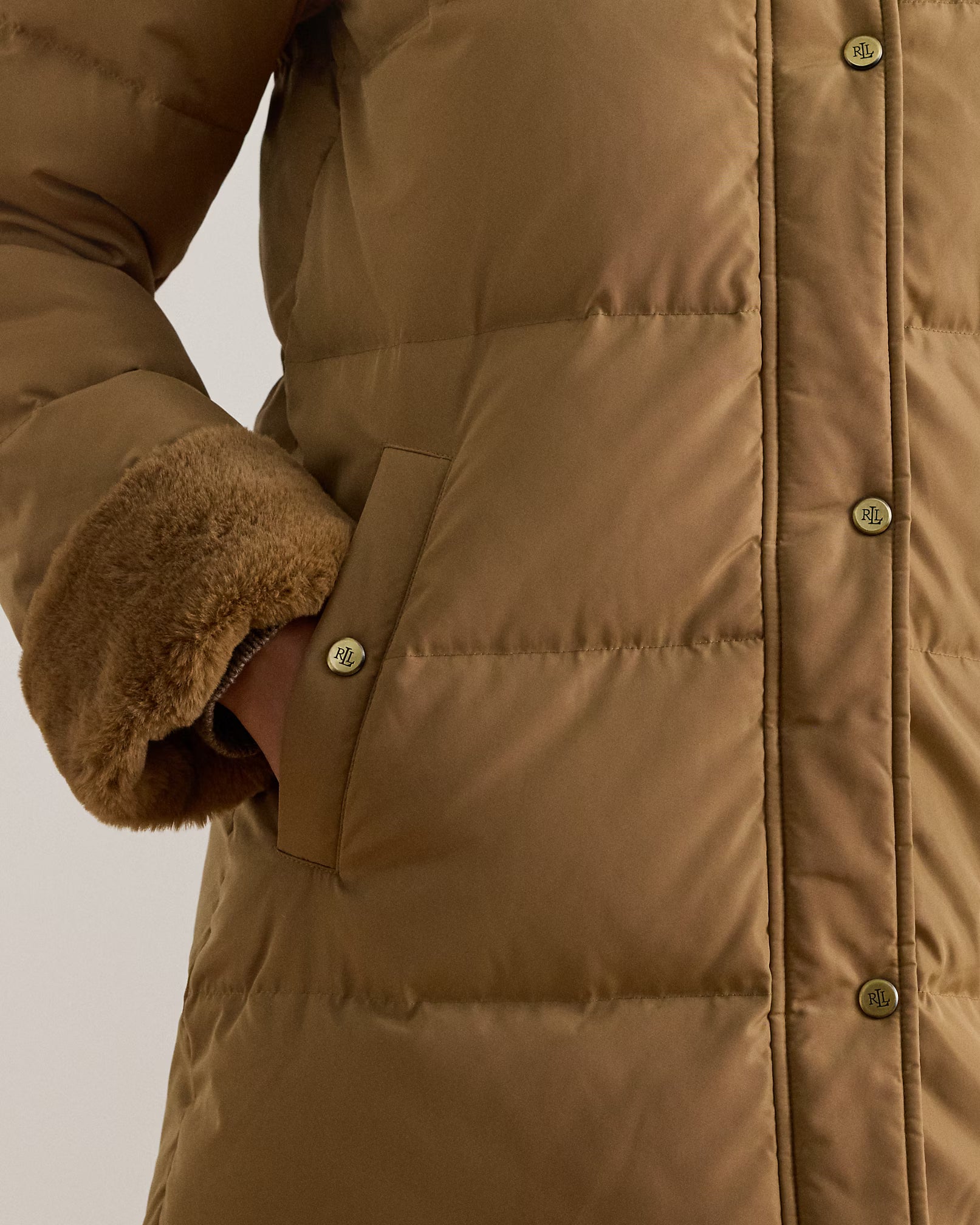 Questo piumino lungo unisce eleganza e funzionalità grazie alle finiture in morbida pelliccia ecologica nel cappuccio e sui polsini che donano un aspetto raffinato e sostenibile. Il design trapuntato con cuciture parallele garantisce calore e struttura ottimale, mentre il cappuccio rimovibile offre versatilità secondo le condizioni climatiche. Il logo "LRL" lucido sulla manica aggiunge un dettaglio distintivo, sottolineando l’attenzione al dettaglio e la qualità artigianale del capo. Composizione: Esterno, fodera e finitura in pelliccia ecologica: 100% poliestere. Imbottitura: 60% piumino d'anatra, 40% altre piume.