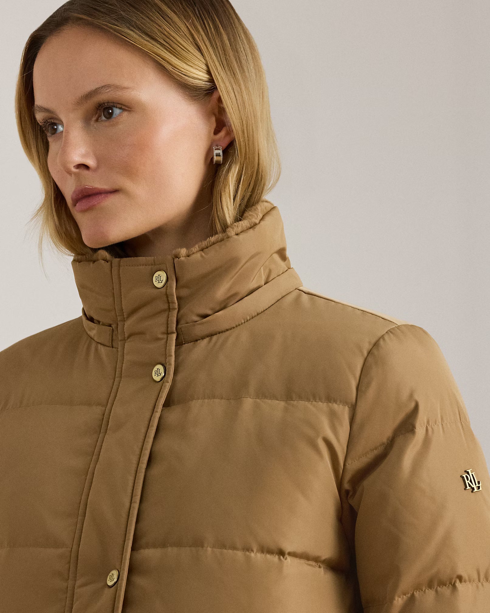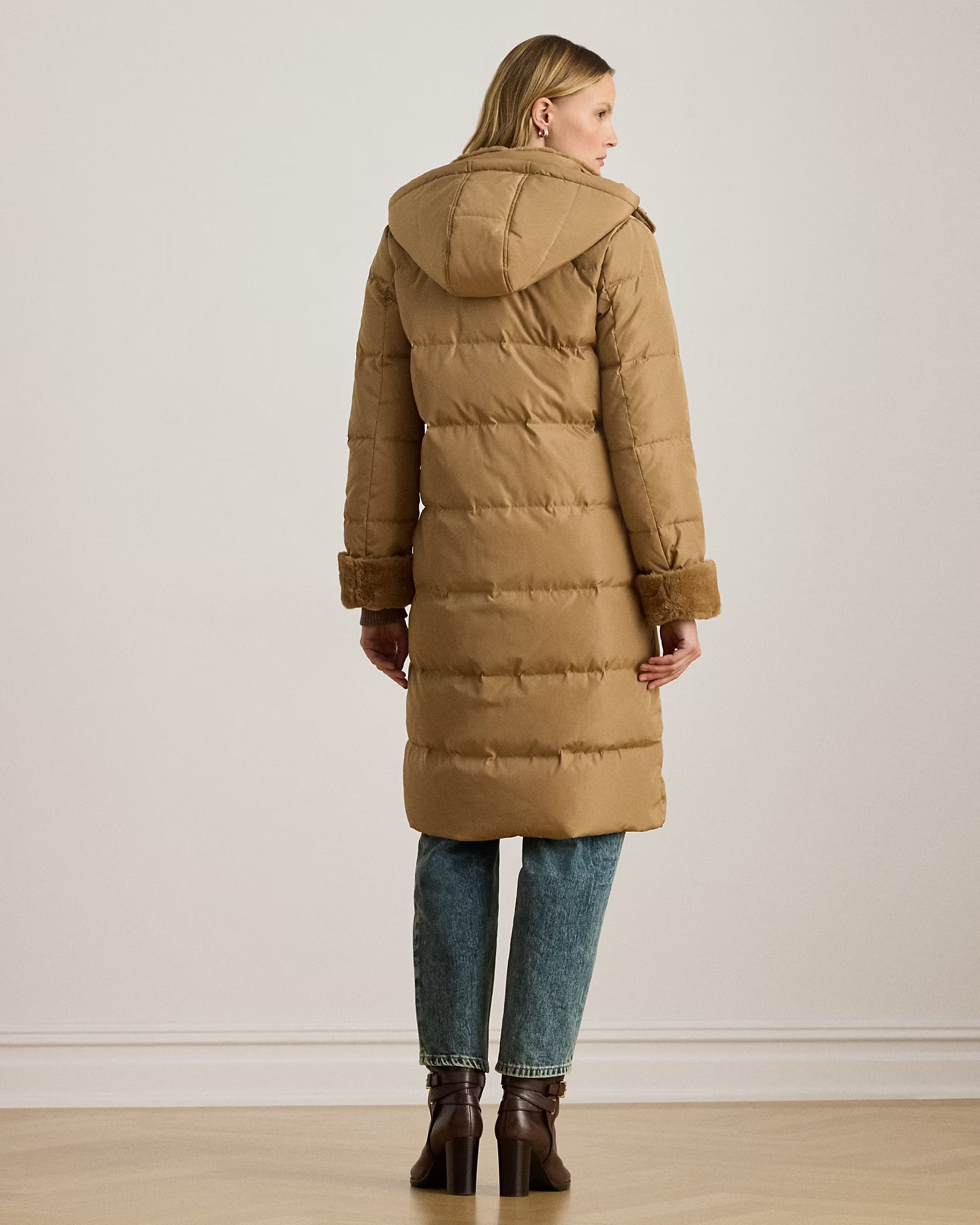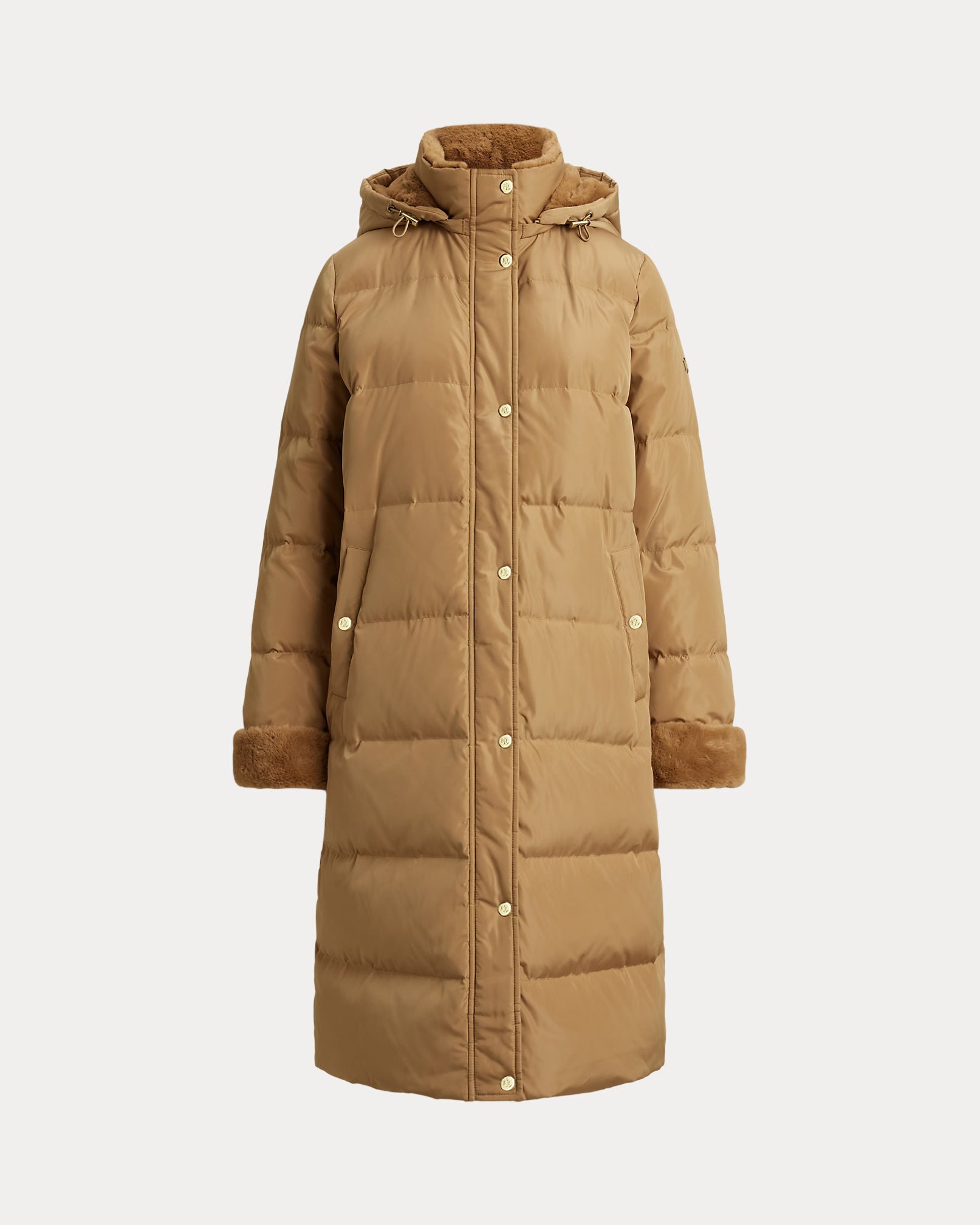 Questo piumino lungo unisce eleganza e funzionalità grazie alle finiture in morbida pelliccia ecologica nel cappuccio e sui polsini che donano un aspetto raffinato e sostenibile. Il design trapuntato con cuciture parallele garantisce calore e struttura ottimale, mentre il cappuccio rimovibile offre versatilità secondo le condizioni climatiche. Il logo "LRL" lucido sulla manica aggiunge un dettaglio distintivo, sottolineando l’attenzione al dettaglio e la qualità artigianale del capo. Composizione: Esterno, fodera e finitura in pelliccia ecologica: 100% poliestere. Imbottitura: 60% piumino d'anatra, 40% altre piume.