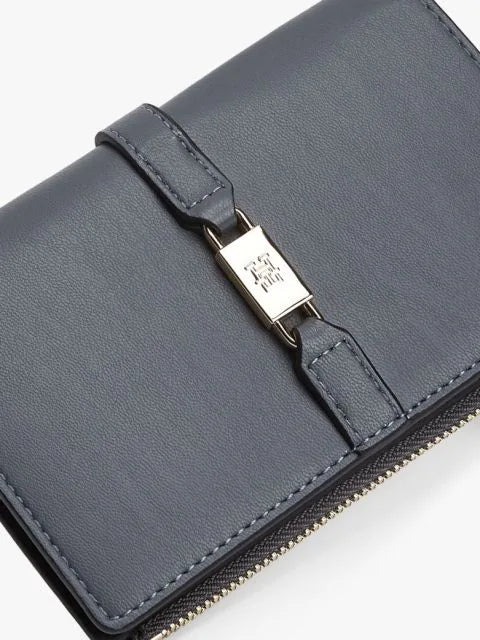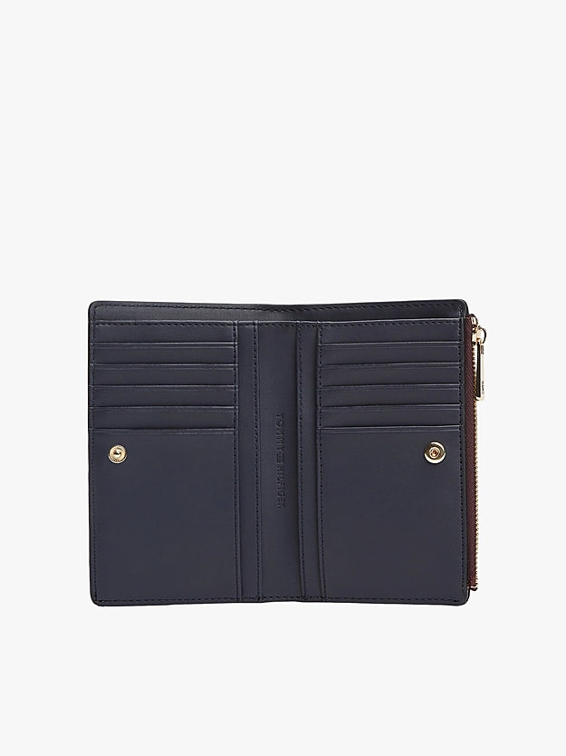 Questo portafoglio bifold Tommy Hilfiger combina stile e praticità con una finitura liscia in poliuretano. Caratterizzato da un elegante monogramma TH in metallo sul davanti, offre molteplici scomparti interni per carte, una tasca dedicata ai documenti e una tasca esterna con cerniera per maggiore sicurezza. La chiusura con bottone automatico garantisce protezione dei vostri effetti personali, mentre il design compatto lo rende ideale sia per occasioni formali che casual. Un accessorio versatile che unisce funzionalità e raffinatezza.