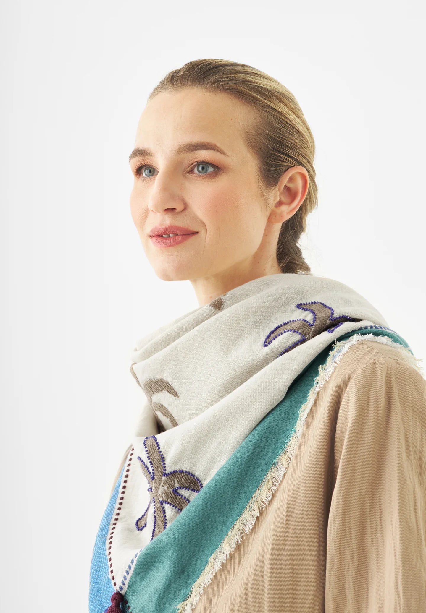 Scopri l'eleganza di questa sciarpa quadrata 130x130cm, un capolavoro di design e comfort. Il tessuto jacquard intrecciato presenta affascinanti motivi a palme su tutta la superficie, impreziositi da delicati ricami con perline. La composizione in misto cotone, modal, poliacrilico e lana crea un equilibrio perfetto: il cotone garantisce naturalezza, il modal offre leggerezza fluida, il poliacrilico assicura morbidezza ultrasoft e la lana dona calore piacevole. I colori contrastanti del blu del bordo e le tonalità sabbia creano un'armonia cromatica ideale per ogni stagione. Bordi con frange tutt'intorno completano il design sofisticato. Perfetta per le giornate fresche e gli stili versatili. Composizione: 77% cotone 12% modal 9% poliacrilico 2% lana