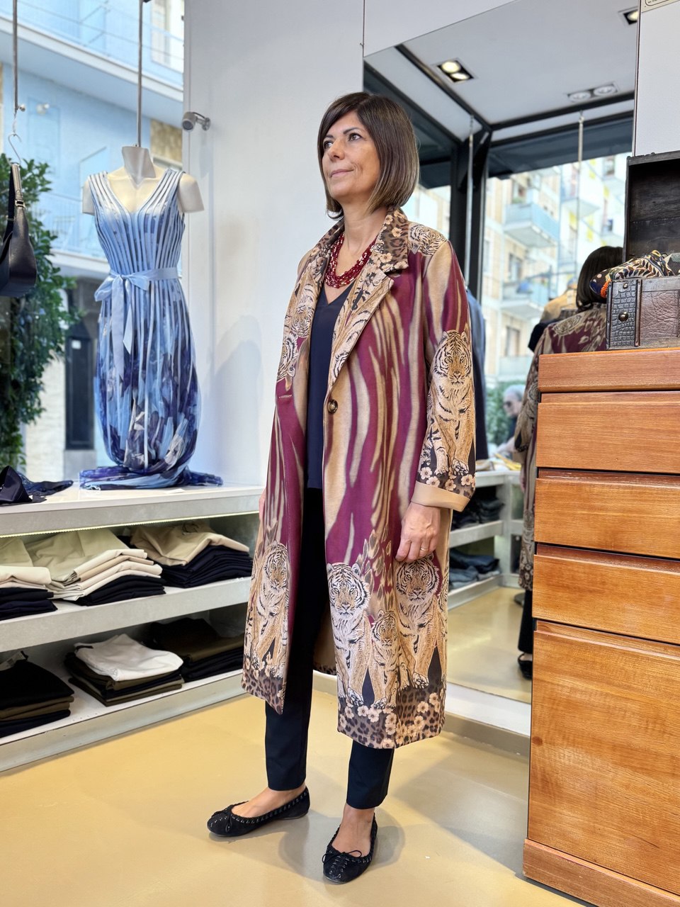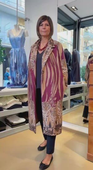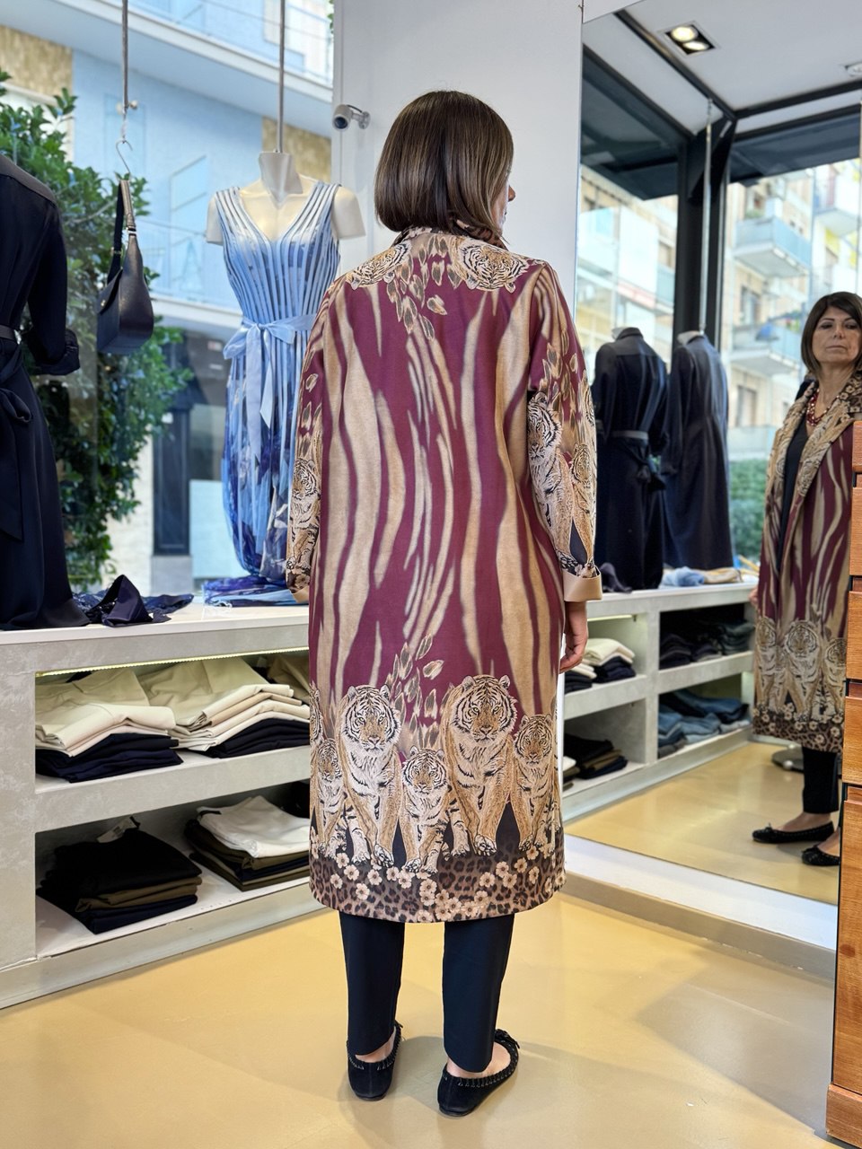 Realizzato in un tessuto morbido simile al camoscio, presenta un'originale stampa tigre che cattura lo sguardo. La fantasia è sapientemente bilanciata da una base color borgogna e da dettagli che richiamano il manto tigrato, creando un effetto visivo di grande impatto. Il taglio dritto e la lunghezza al ginocchio lo rendono versatile e facile da abbinare.