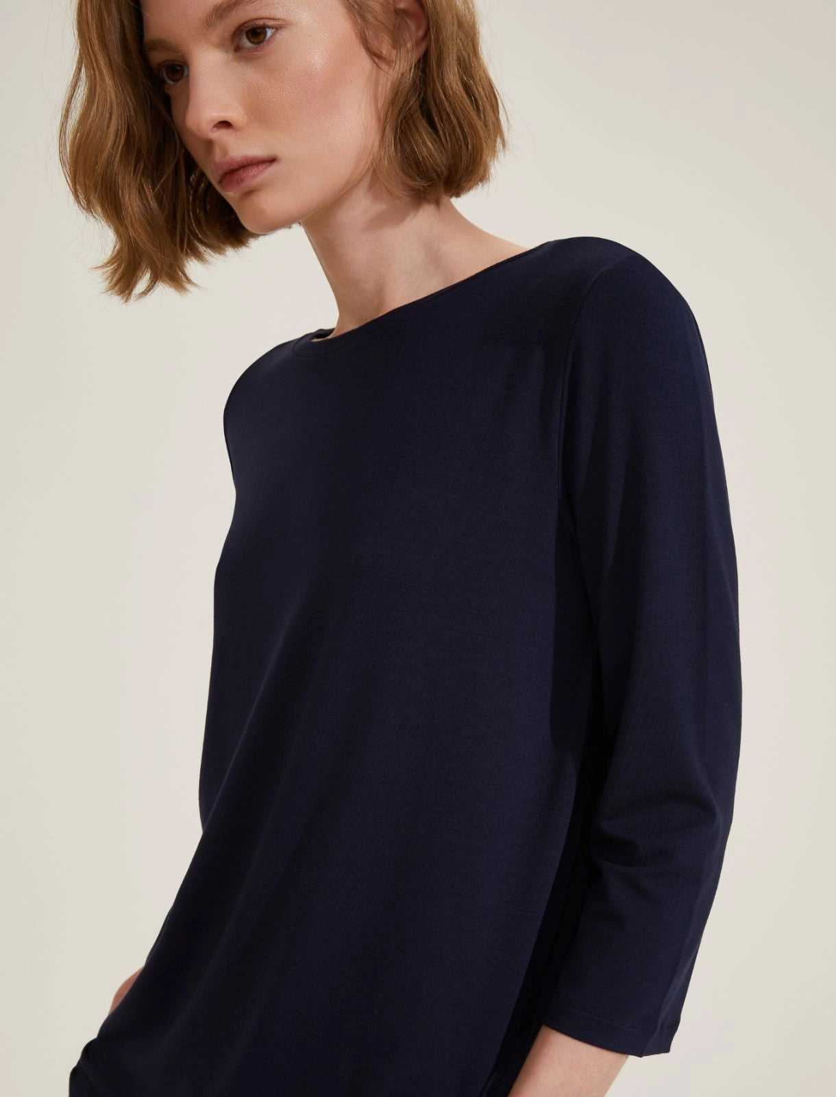Questa T-shirt con maniche a 3/4 è un must-have per la primavera. Il jersey di viscosa stretch la rende comoda e il fit dritto permette di abbinarla a cardigan e blazer leggeri. Con la sua manica a tre quartiè un capo contemporaneo. Inoltre, la viscosa proviene dalla cellulosa del legno, rispettando l'ambiente.