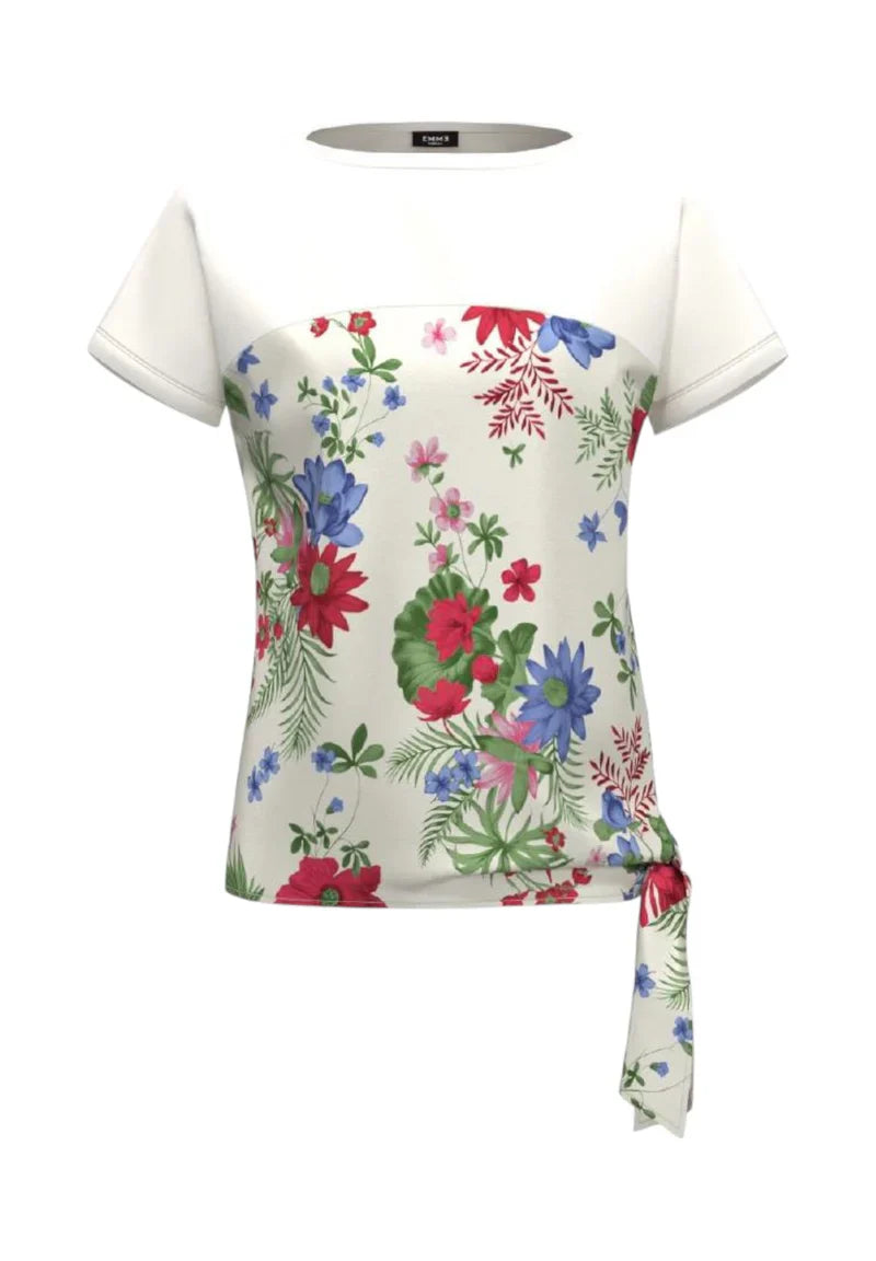 Questa blusa combina funzionalità e stile con una parte alta realizzata in jersey di cotone stretch per massima vestibilità e comfort, e una parte bassa in twill tecnico che conferisce struttura e resistenza. Il design presenta uno scollo stondato elegante, maniche corte e un carré sia sul davanti che sul retro, garantendo una forma armoniosa e ben definita. Il dettaglio del nodo sul fianco sinistro aggiunge un tocco moderno e sofisticato. Il tessuto floreale è composto al 100% da poliestere per durabilità, mentre il tessuto a maglia unisce cotone ed elastan per elasticità e comfort.