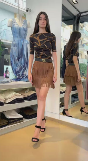 Realizzata in cotone stretch traspirante, questa t-shirt con scollo a barchetta garantisce comfort e freschezza tutto il giorno. La distintiva stampa a cinture equestri di Lauren Ralph Lauren aggiunge un tocco di eleganza senza tempo, mentre il logo “LRL” ricamato sull'orlo conferisce un dettaglio raffinato e riconoscibile, perfetto per un look sofisticato e moderno. Composizione: 94% cotone, 6% elastan. Lavabile in acqua.