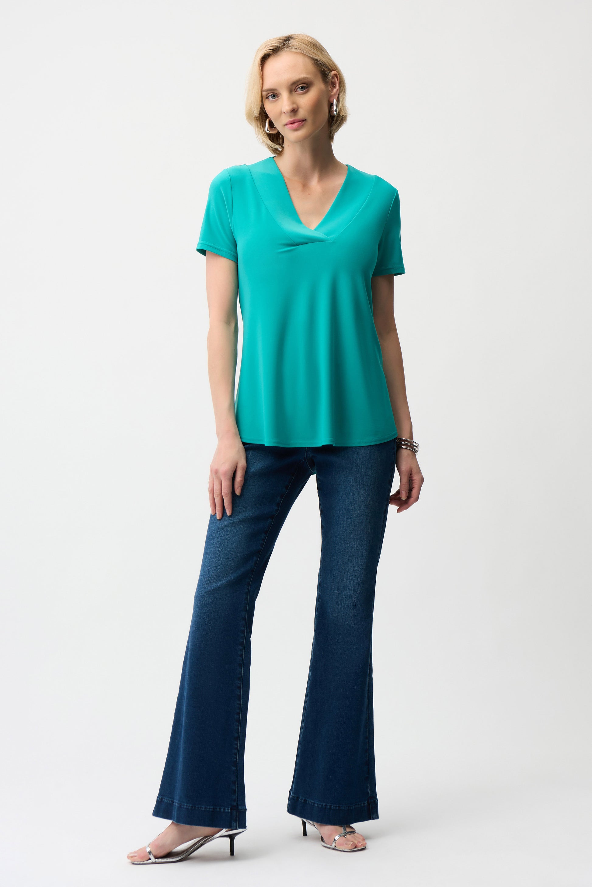 Questo top in maglia effetto seta rappresenta la fusione ideale tra eleganza sofisticata e comfort contemporaneo. Lo scollo a V profondo, presente sia davanti che dietro, crea linee affusolate che valorizzano la silhouette con discrezione. Il tessuto morbido e luminoso cattura la luce naturalmente, mentre il taglio leggermente svasato al fondo assicura una caduta fluida e movimento elegante. Perfetto per transizioni di stagione, si abbina facilmente a jeans, pantaloni o gonne, elevando qualsiasi outfit con un tocco di raffinatezza senza sforzo. Composizione: 96% Poliestere, 4% Elastan