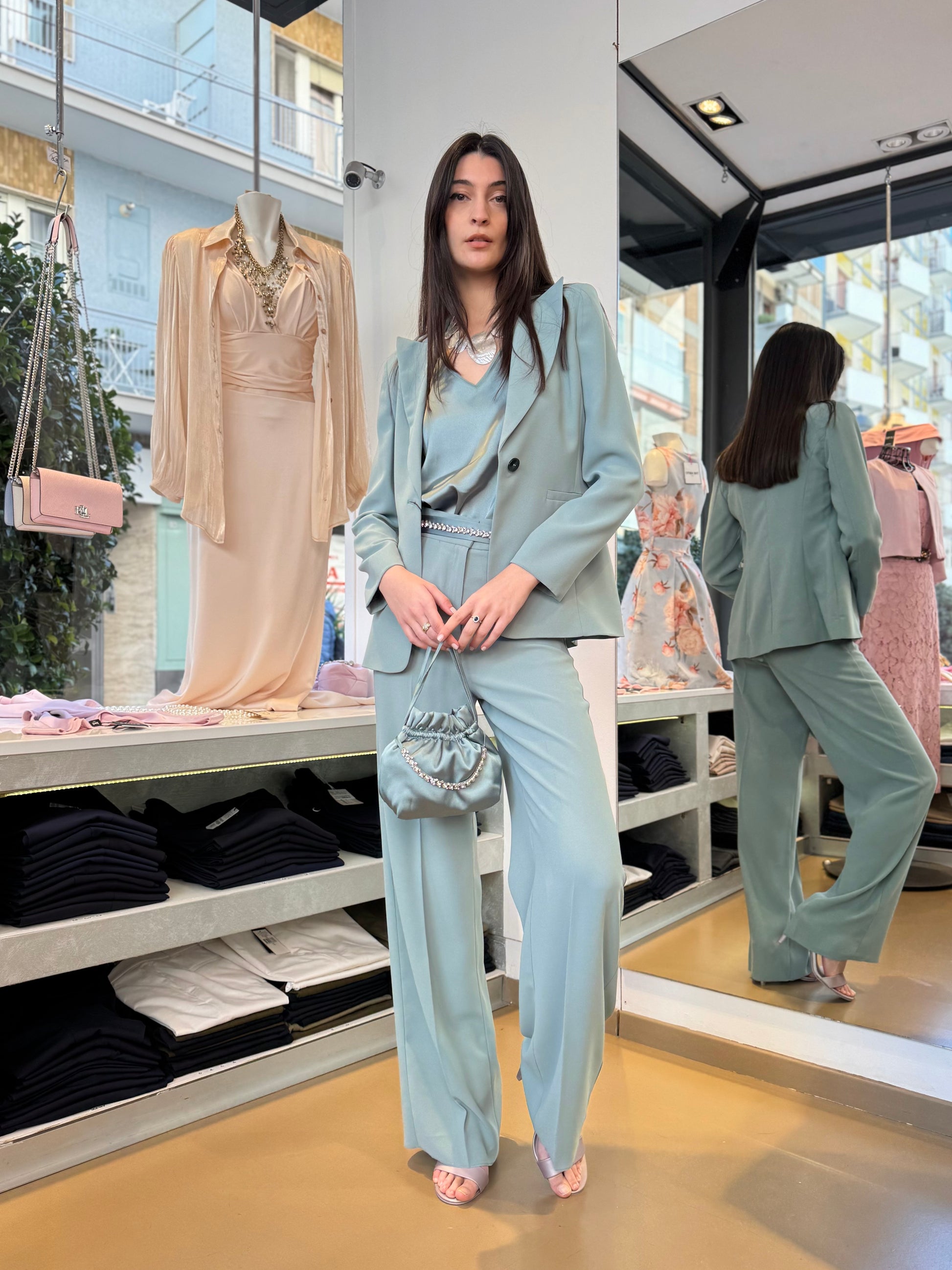 Tailleur pantalone in cady verde giada