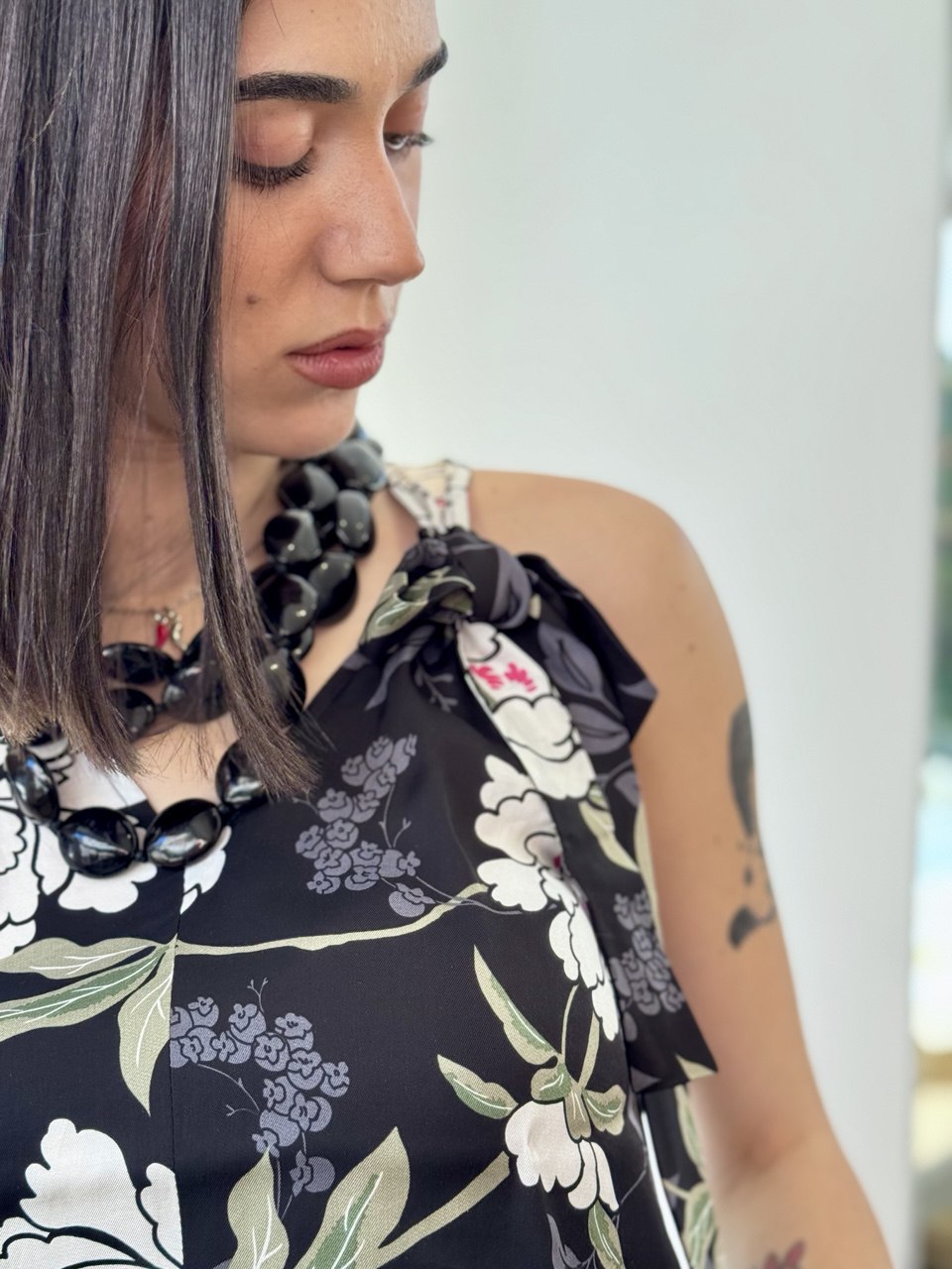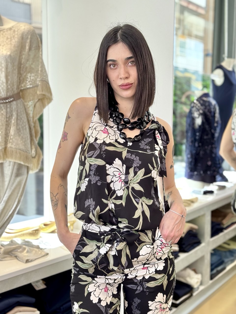 Top in stampa floreale con fondo nero