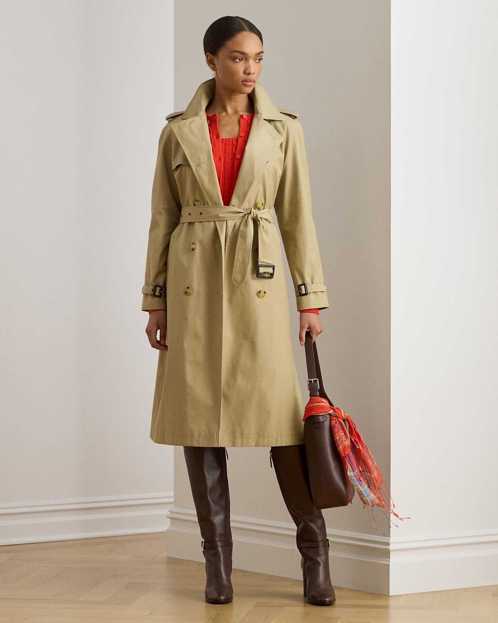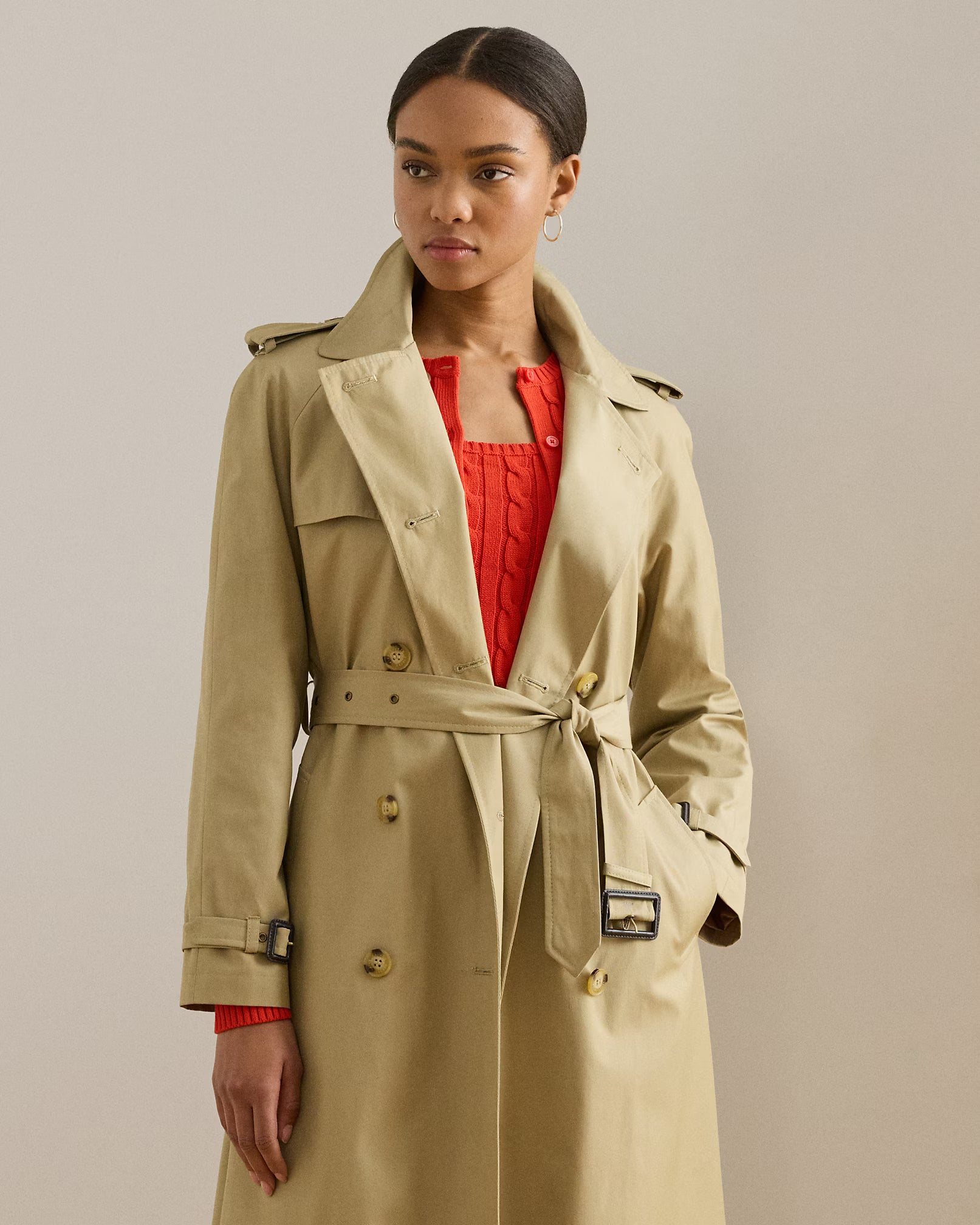 Questo trench lungo doppiopetto, realizzato in un leggero misto cotone, valorizza la silhouette con una cintura in tessuto coordinato dall'effetto raffinato. Il design presenta spalline con bottoni e bottoni effetto corno incisi "Lauren Ralph Lauren" che ne sottolineano l'eleganza. Le pattine frangivento e il tessuto esterno resistente all’acqua garantiscono protezione dalle intemperie, mentre il taglio dritto e la lunghezza sotto il ginocchio assicurano una vestibilità classica e confortevole. Collo ampio, maniche raglan lunghe con listini e fibbia completano un capo sofisticato e funzionale.
