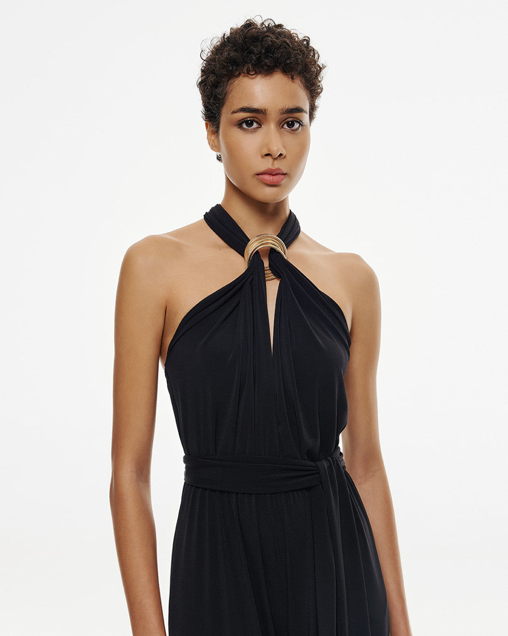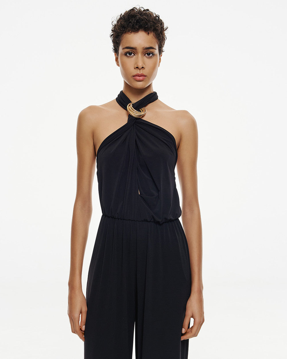 Indossa una tuta dal taglio raffinato e seducente. Con scollatura a V decorata da lacci, elastico in vita e taglio frontale con dettaglio metallico, questa tuta offre un look notturno di lusso. Tessuto elastico e vestibilità regolare la rendono comoda per ogni occasione speciale. Composizione: 95% poliestere 5% spandex. Si consiglia lavaggio in lavanderia.